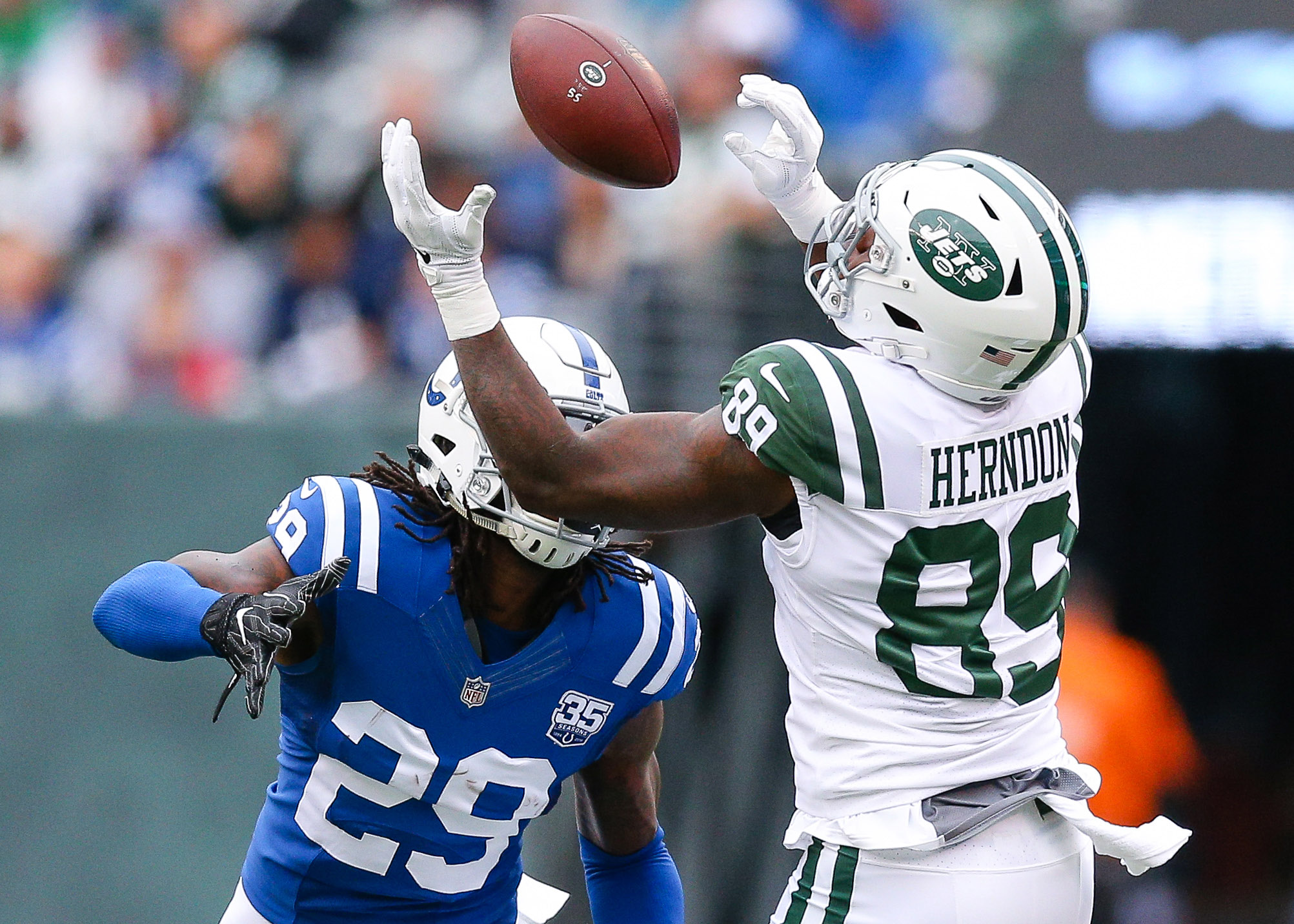 Oct 14, 2018; East Rutherford, NJ, USA; New York Jets tight end Chris Herndon (89) catches a pass over Indianapolis Colts cornerback Chris Milton (28) during the first half at MetLife Stadium. Mandatory Credit: Vincent Carchietta-USA TODAY Sports / Vincent Carchietta
