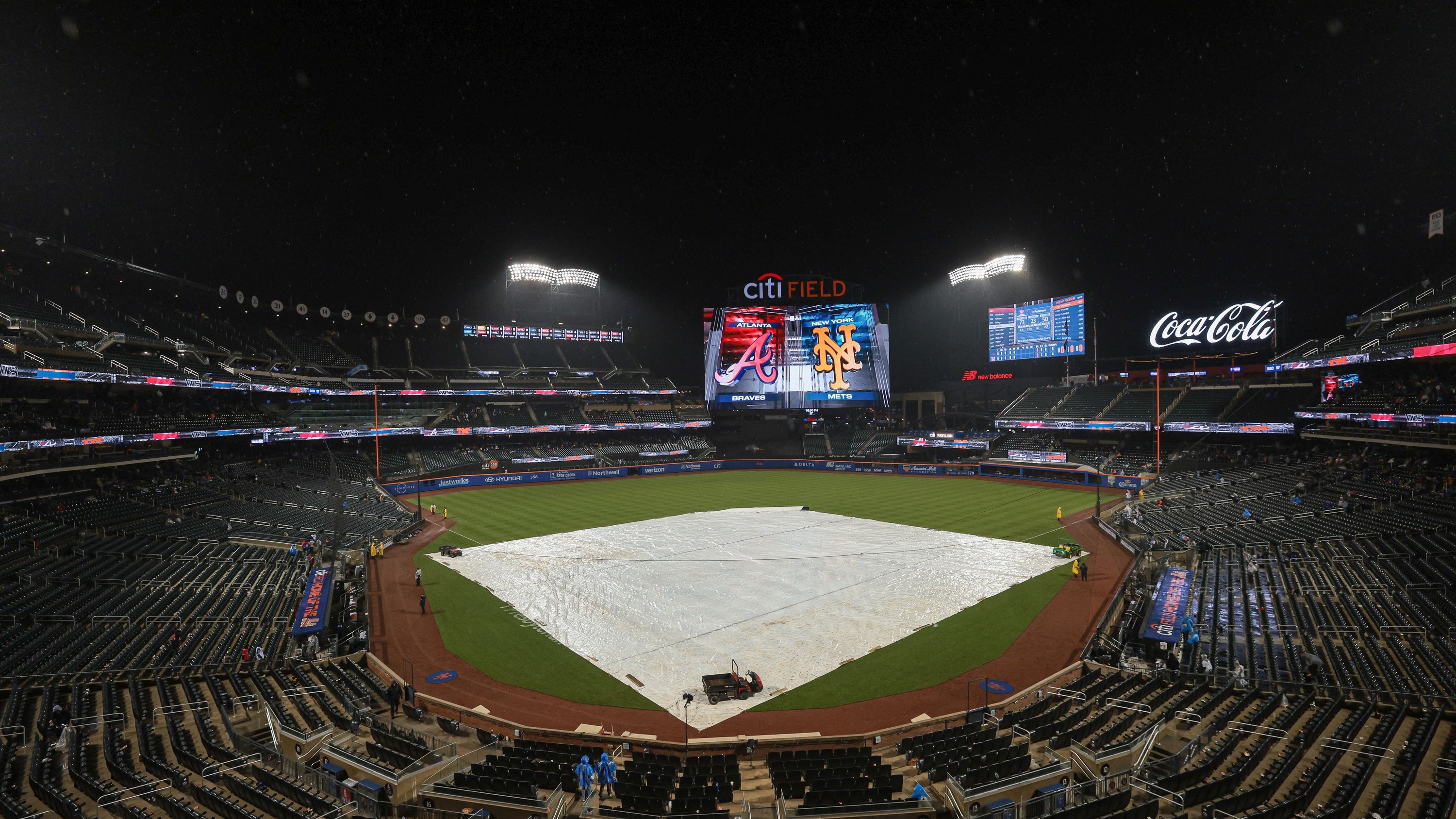 Apr 28, 2023; New York City, New York, USA; The tarp covers the field during a rain delay after the bottom of the fifth inning of the MLB National League game between the New York Mets and the Atlanta Braves at Citi Field. / Vincent Carchietta-USA TODAY Sports