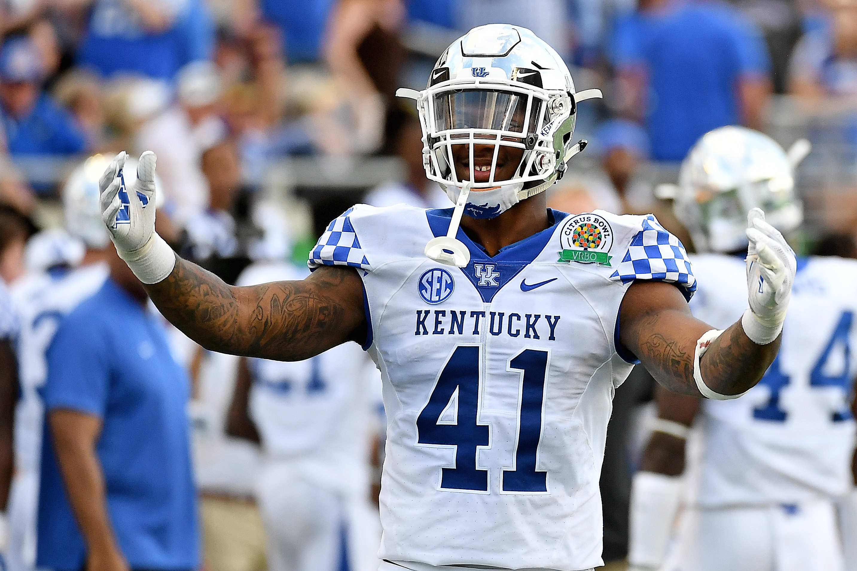 Jan 1, 2019; Orlando, FL, USA; Kentucky Wildcats linebacker Josh Allen (41) reacts to the crowd during the second half against the Penn State Nittany Lions in the 2019 Citrus Bowl at Camping World Stadium. Mandatory Credit: Jasen Vinlove-USA TODAY Sports / Jasen Vinlove