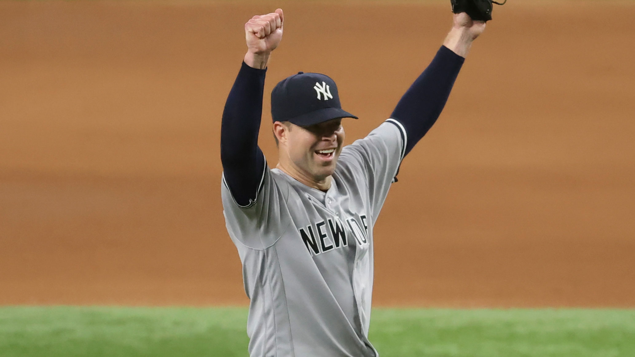 May 19, 2021; Arlington, Texas, USA; New York Yankees starting pitcher Corey Kluber (28) celebrates after throwing a no-hitter against the Texas Rangers at Globe Life Field. / Kevin Jairaj-USA TODAY Sports