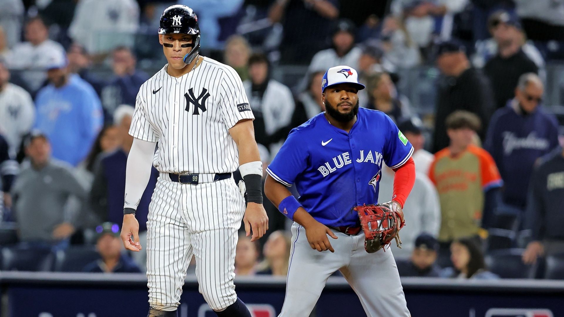 Oct 7, 2025; Bronx, New York, USA; New York Yankees outfielder Aaron Judge (99) flips his bat after hitting a three-run home run in the fourth inning against the Toronto Blue Jays during game three of the ALDS round for the 2025 MLB playoffs at Yankee Stadium. / Wendell Cruz-Imagn Images