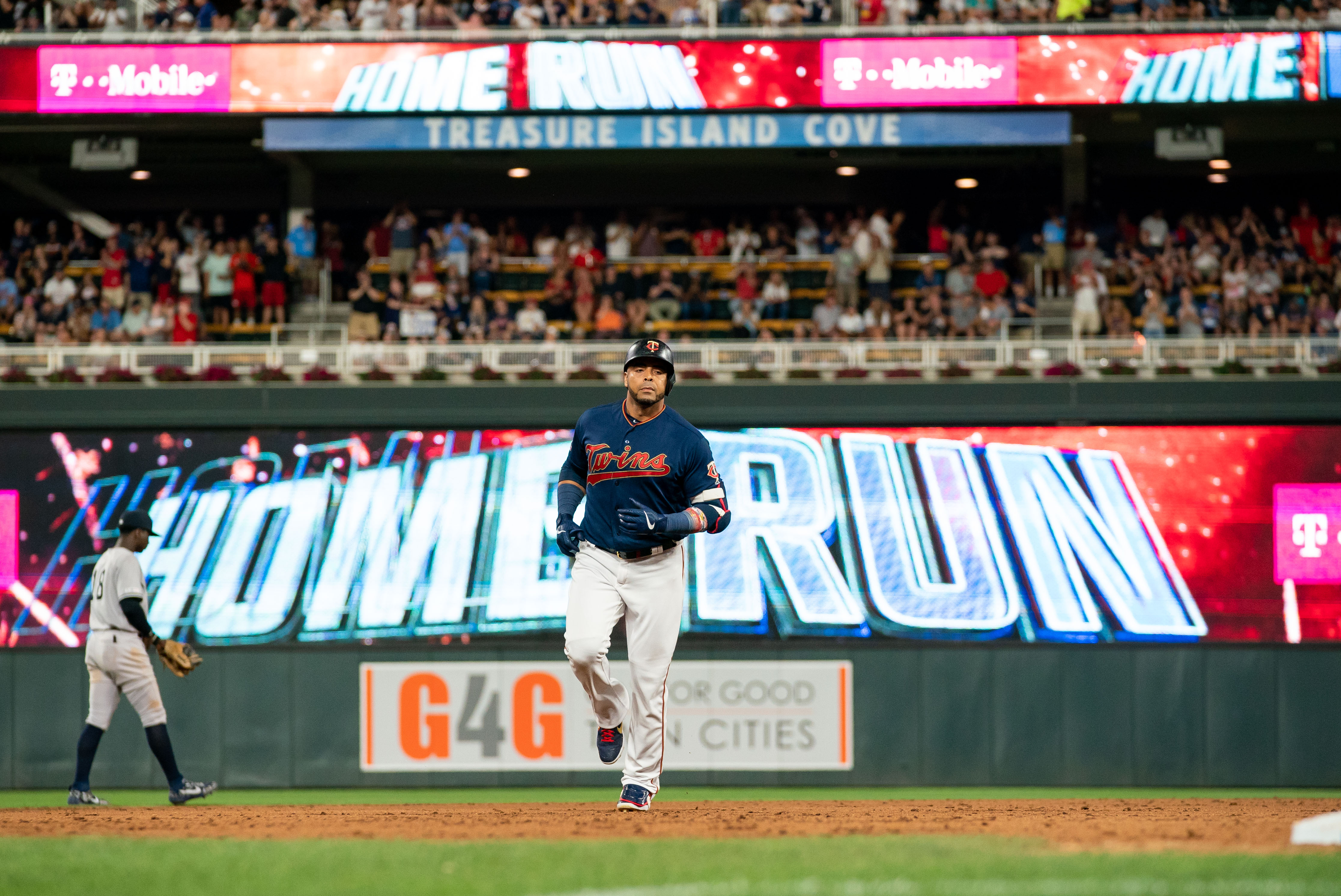 Jul 24, 2019; Minneapolis, MN, USA; Minnesota Twins designated hitter Nelson Cruz (23) celebrates his home run in the fifth inning against New York Yankees at Target Field. Mandatory Credit: Brad Rempel-USA TODAY Sports / Brad Rempel