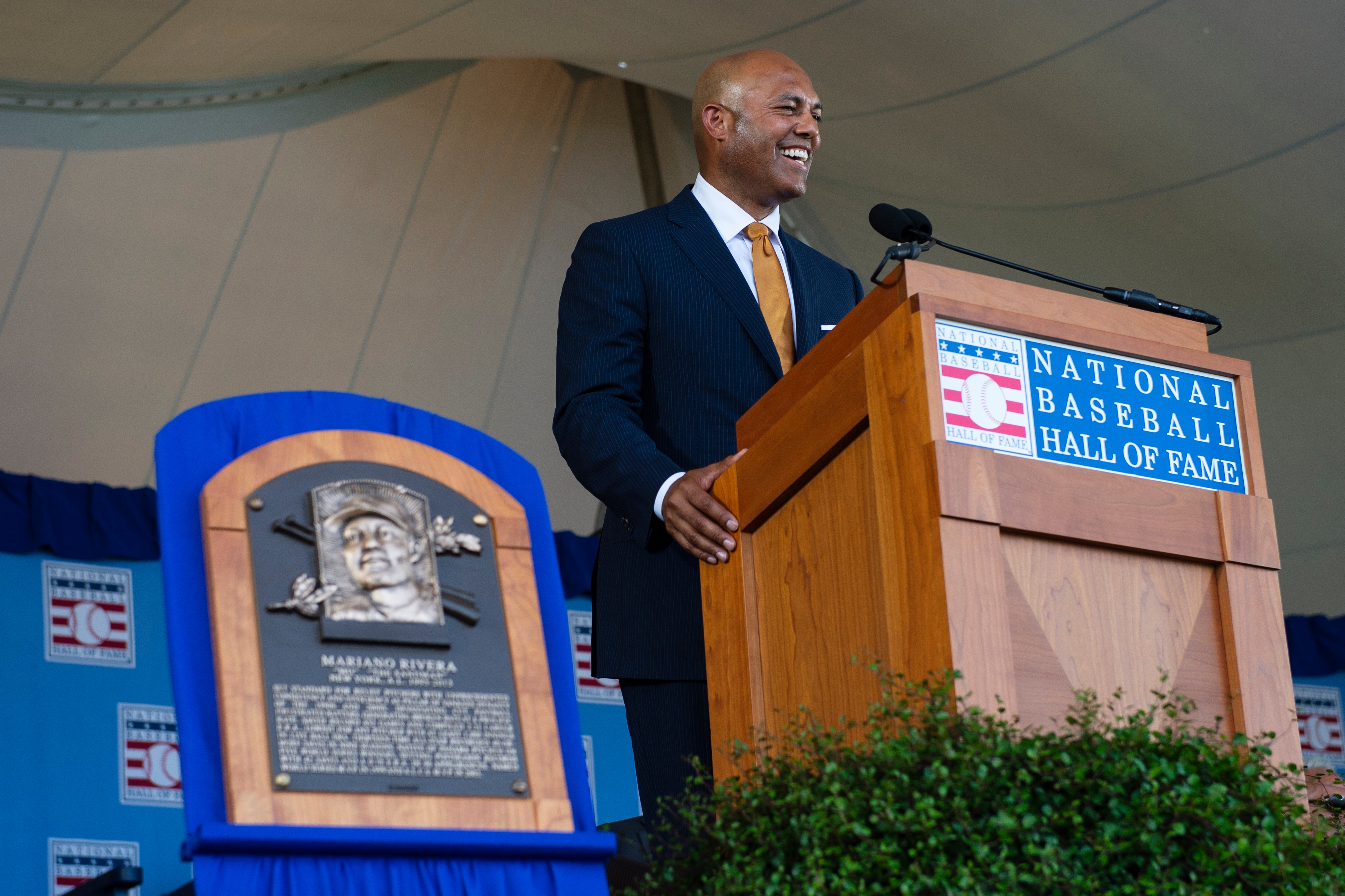 Jul 21, 2019; Cooperstown, NY, USA; Hall of Fame Inductee Mariano Rivera makes his acceptance speech during the 2019 National Baseball Hall of Fame induction ceremony at the Clark Sports Center. Mandatory Credit: Gregory J. Fisher-USA TODAY Sports / Gregory Fisher