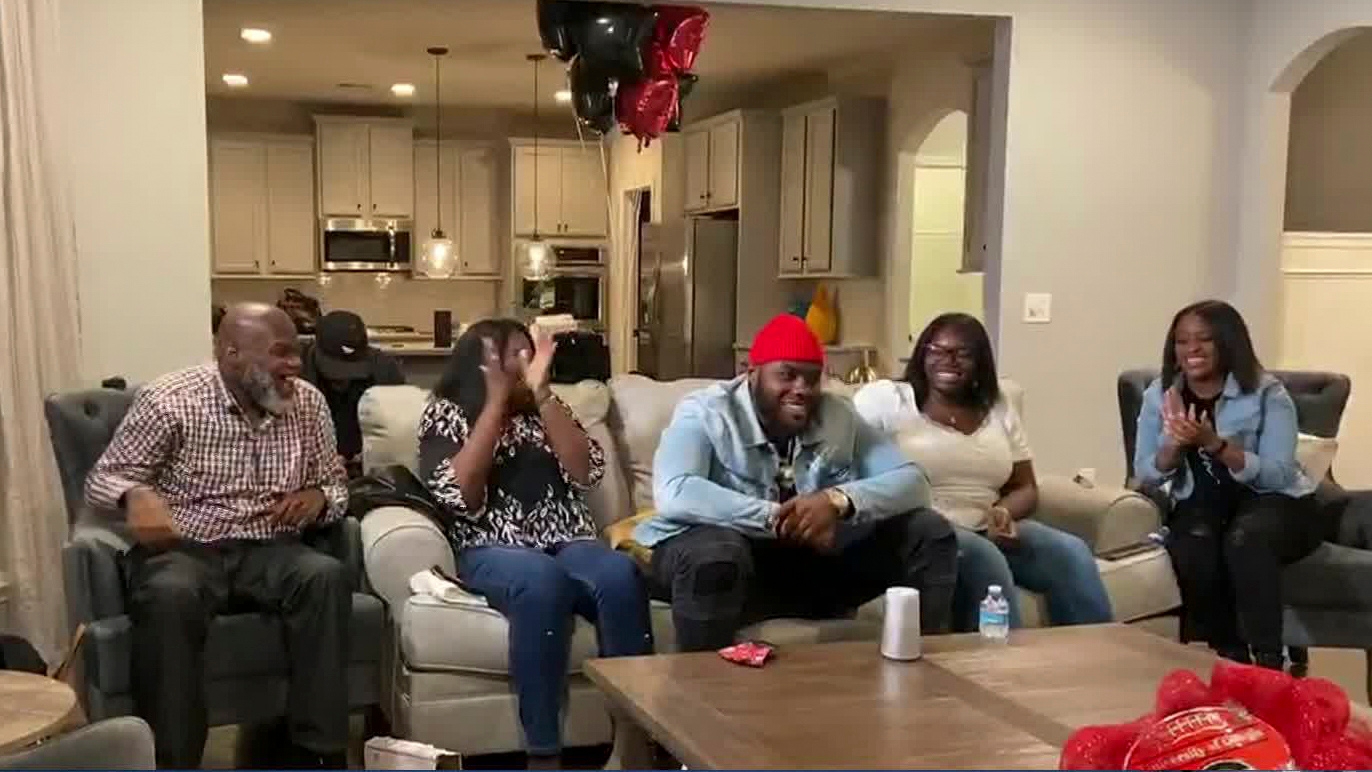 Apr 23, 2020; In this still image from video provided by the NFL, Andrew Thomas, center, smiles during the 2020 NFL Draft. Thomas was selected number four overall to the New York Giants. Mandatory Credit: NFL/Handout Photo via USA TODAY Sports / NFL Handout Photo