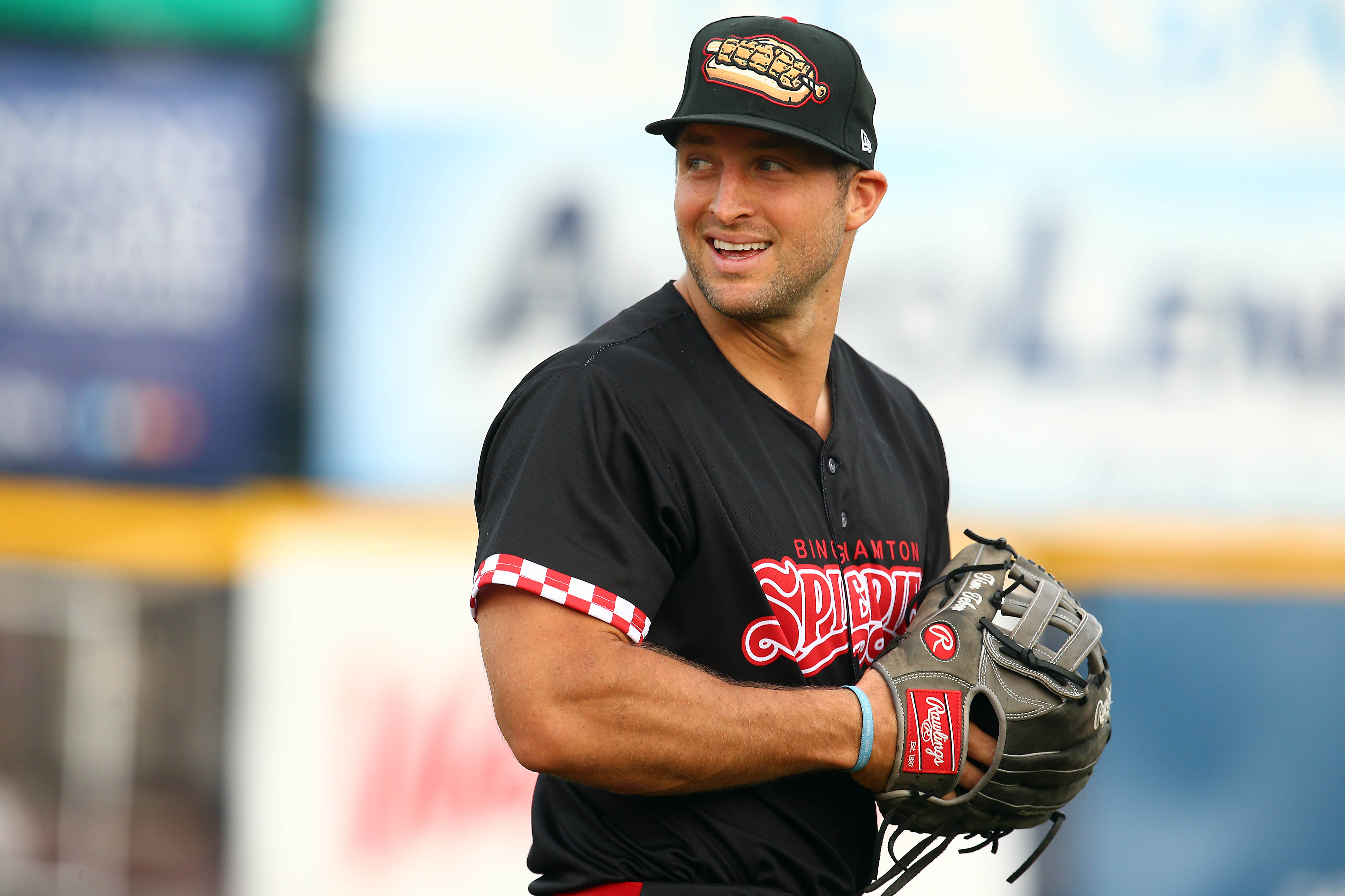 Jun 8, 2018; Trenton, NJ, USA; Binghamton Rumble Ponies left fielder Tim Tebow smiles during the game against the Trenton Thunder in a three-game series at Arm and Hammer Park. Mandatory Credit: Bob Karp-Daily Record via USA TODAY NETWORK / Bob Karp
