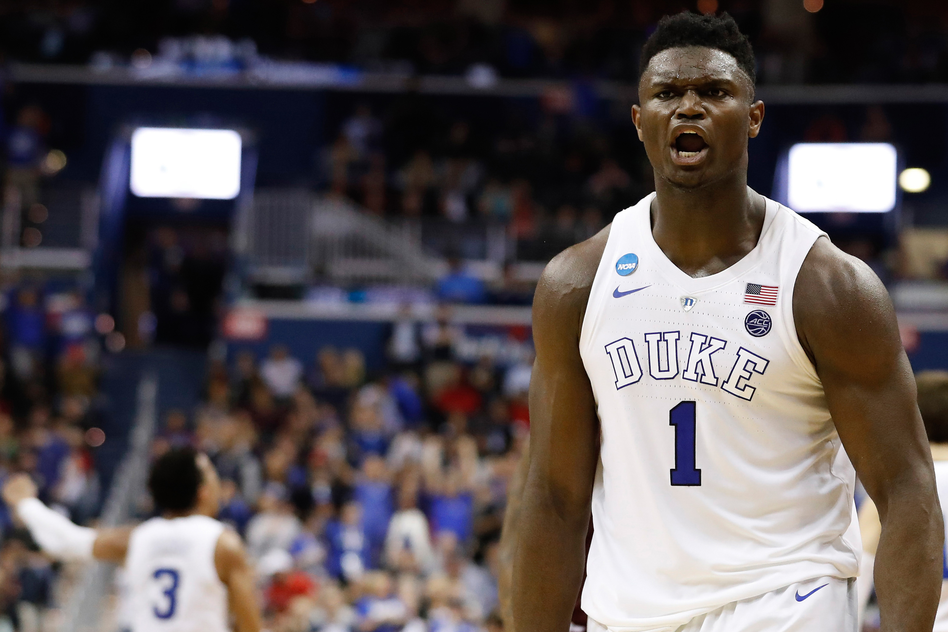 Duke Blue Devils forward Zion Williamson reacts against the Virginia Tech Hokies in the semifinals of the East Regional of the 2019 NCAA Tournament at Capital One Arena. / Geoff Burke/USA TODAY Sports