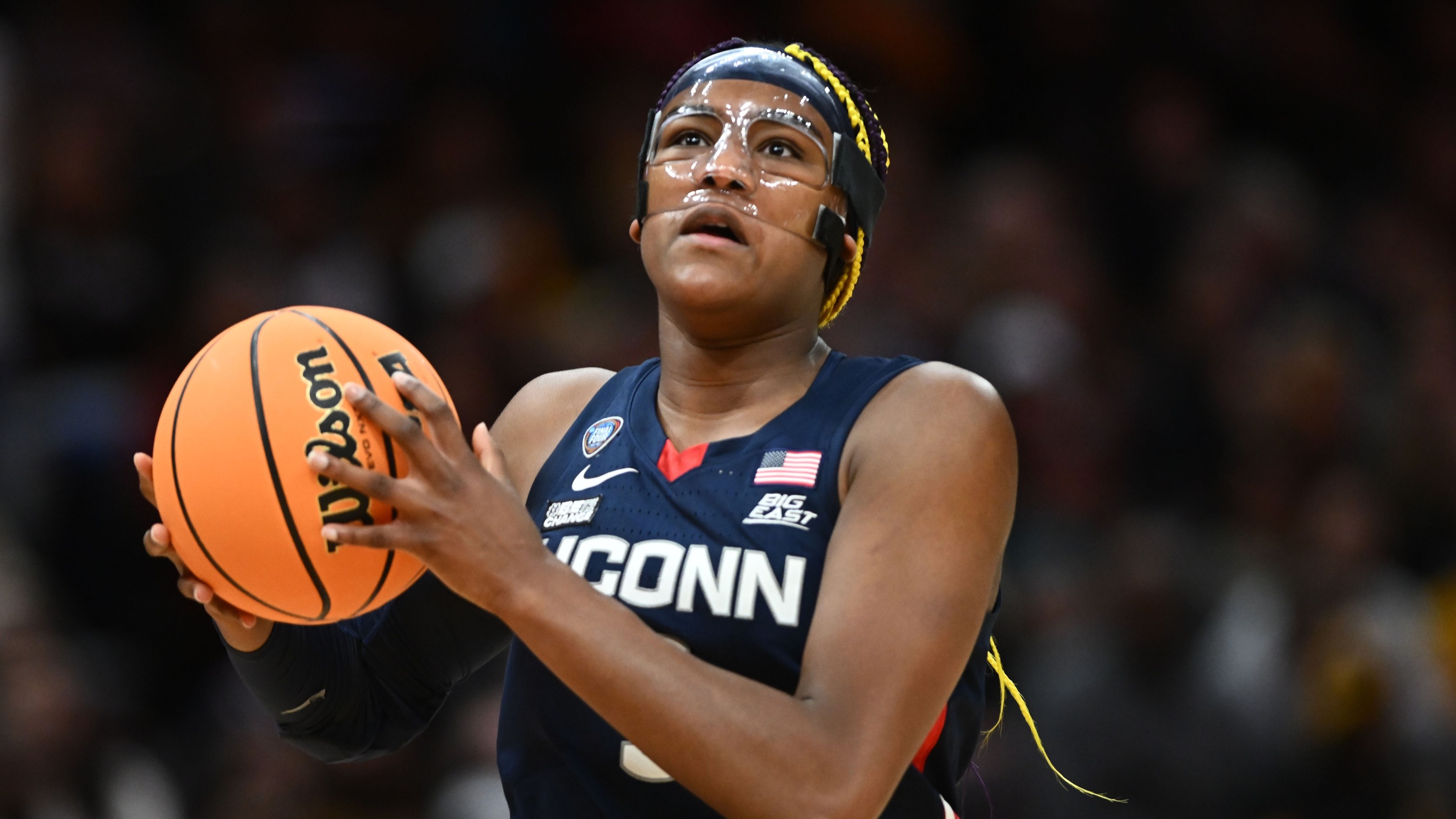 Apr 5, 2024; Cleveland, OH, USA;Connecticut Huskies forward Aaliyah Edwards (3) shoots the ball against the Iowa Hawkeyes in the semifinals of the Final Four of the womens 2024 NCAA Tournament at Rocket Mortgage FieldHouse. / Ken Blaze-USA TODAY Sports