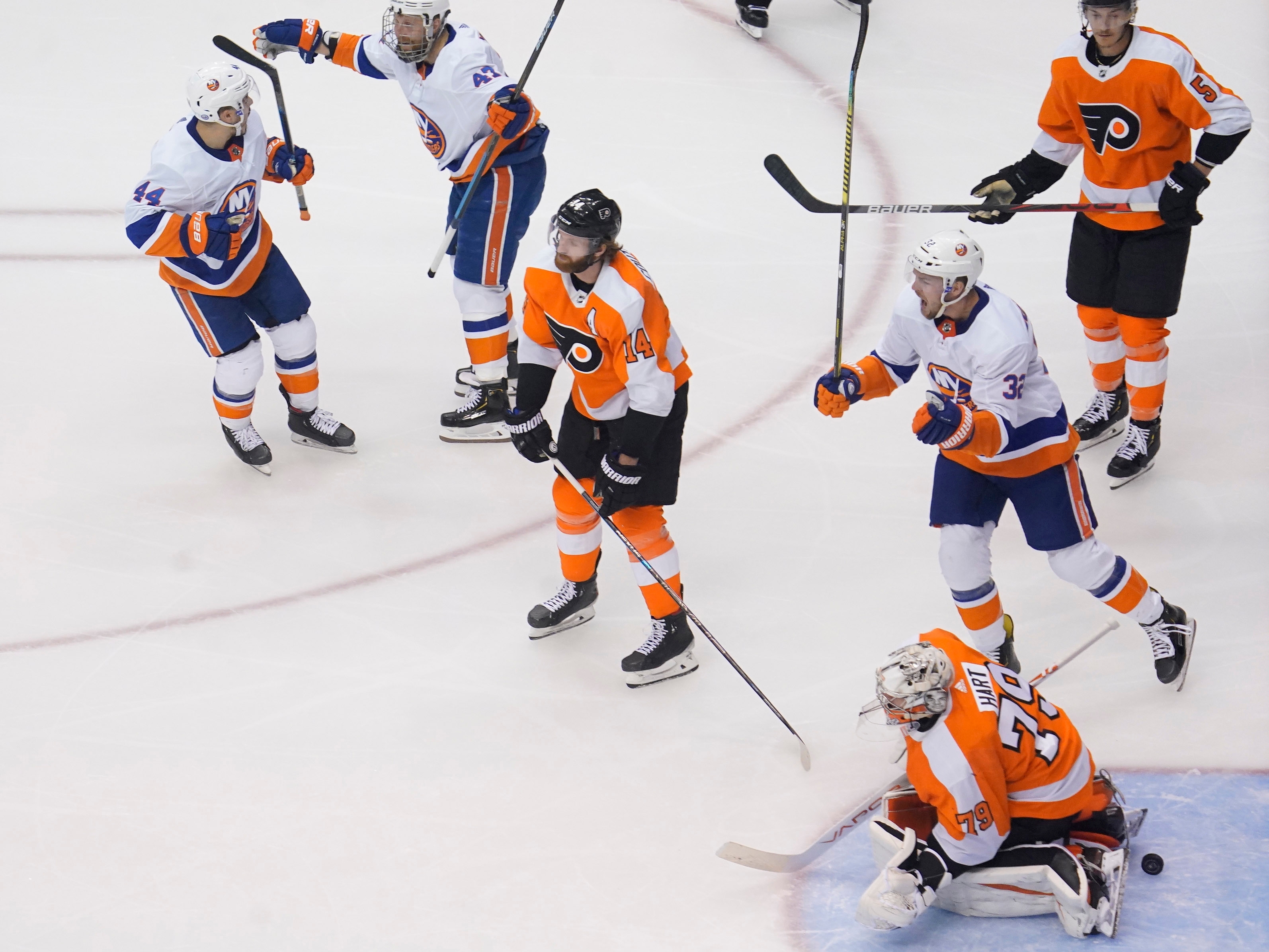 Semyon Varlamov stops 29 shots in Islanders' 4-0 win over FlyersFour different Islanders scored in dominant Game 1 victory8/25/2020, 1:51 AMAug 24, 2020; Toronto, Ontario, CAN; New York Islanders center Jean-Gabriel Pageau (44) celebrates with center Leo Komarov (47) after scoring a goal against the Philadelphia Flyers during the third period in game one of the second round of the 2020 Stanley Cup Playoffs at Scotiabank Arena. Mandatory Credit: John E. Sokolowski-USA TODAY Sports / © John E. Sokolowski-USA TODAY Sports
