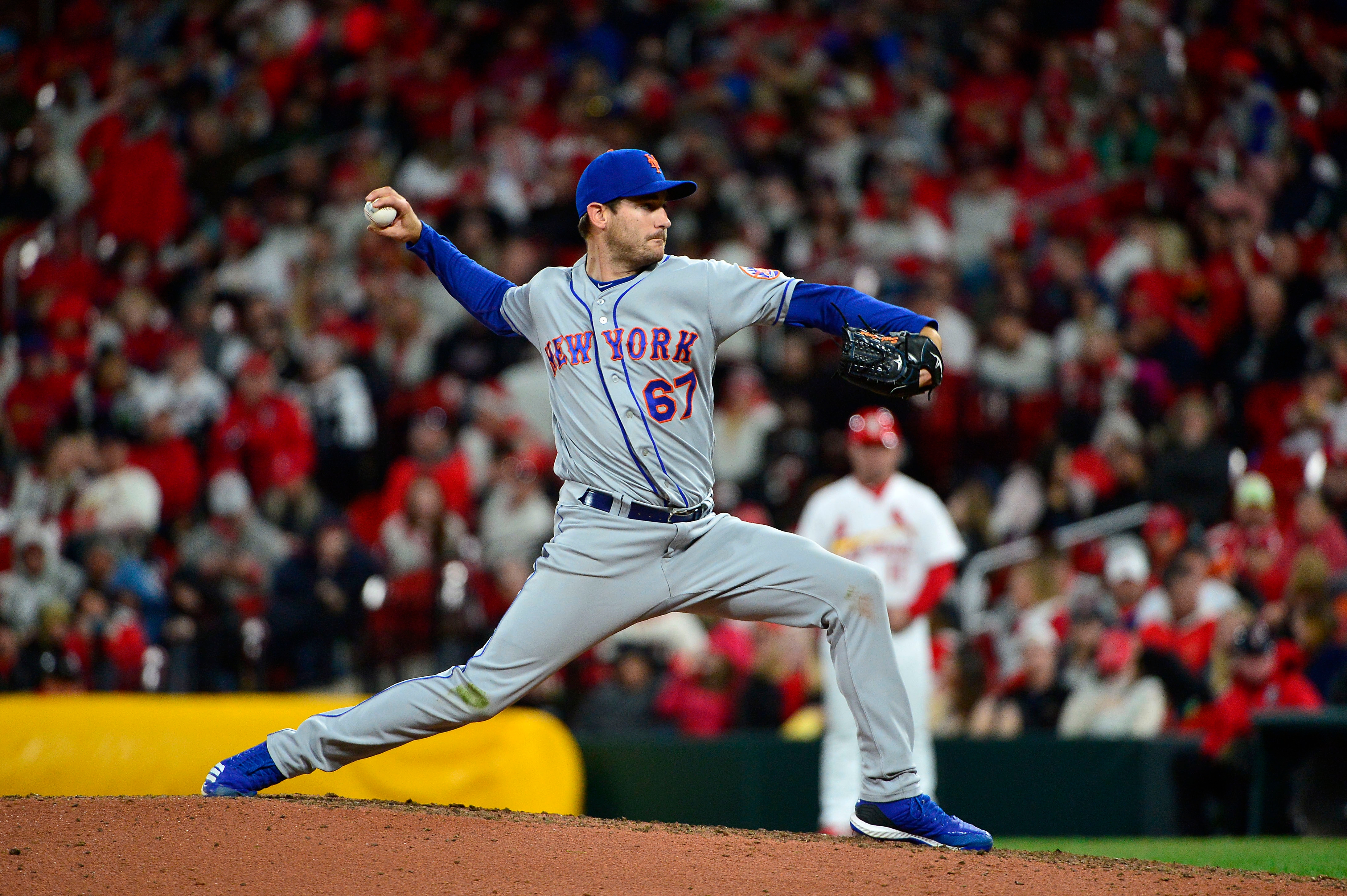 Apr 19, 2019; St. Louis, MO, USA; New York Mets relief pitcher Seth Lugo (67) pitches during the sixth inning against the St. Louis Cardinals at Busch Stadium. Mandatory Credit: Jeff Curry-USA TODAY Sports / Jeff Curry/USA TODAY Sports