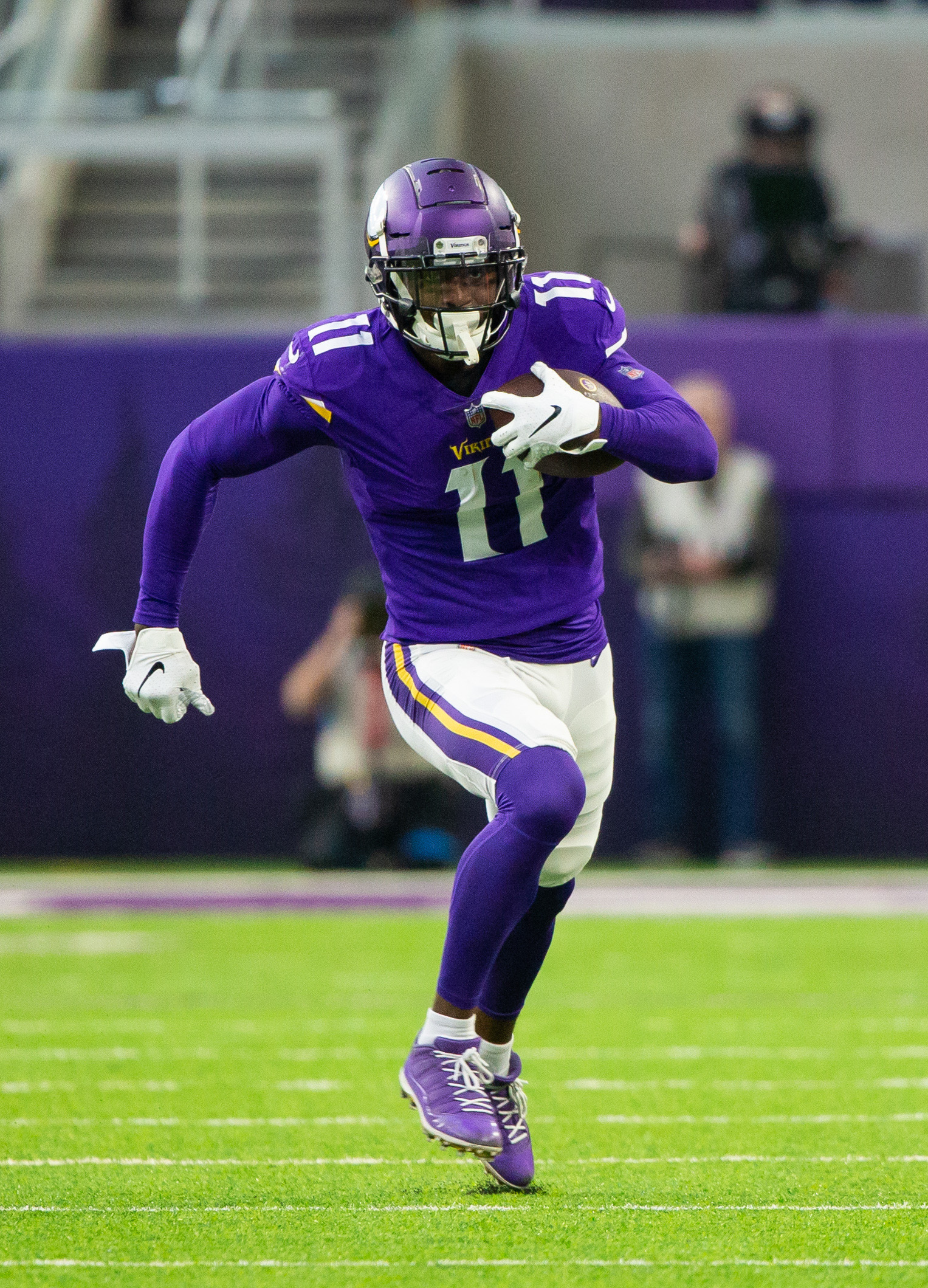 Nov 4, 2018; Minneapolis, MN, USA; Minnesota Vikings wide receiver Laquon Treadwell (11) runs after the catch in the second quarter against Detroit Lions at U.S. Bank Stadium. Mandatory Credit: Brad Rempel-USA TODAY Sports / Brad Rempel