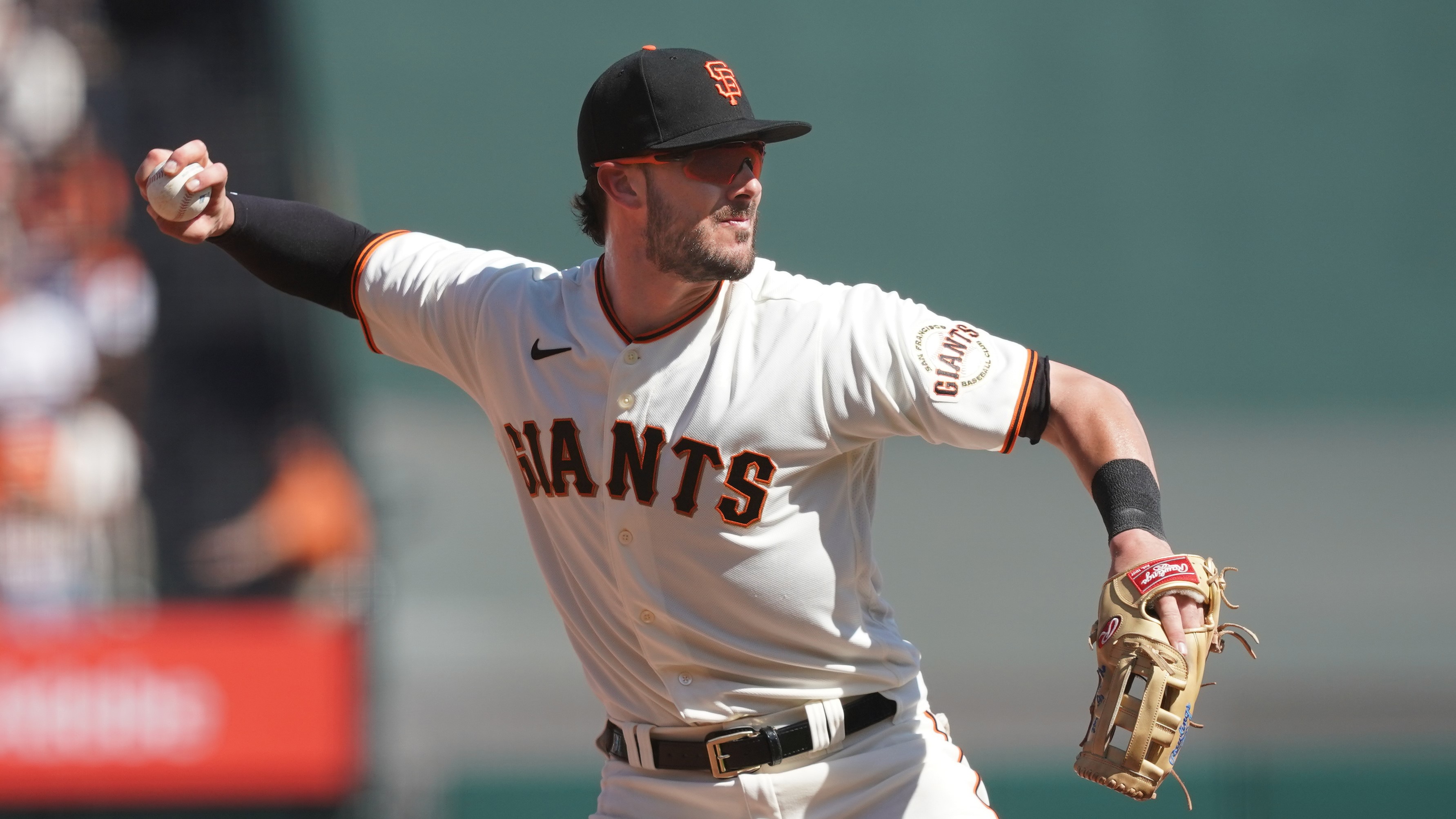 San Francisco Giants third baseman Kris Bryant (23) throws the ball to first base to record an out during the fourth inning against the San Diego Padres at Oracle Park. / Darren Yamashita-USA TODAY Sports