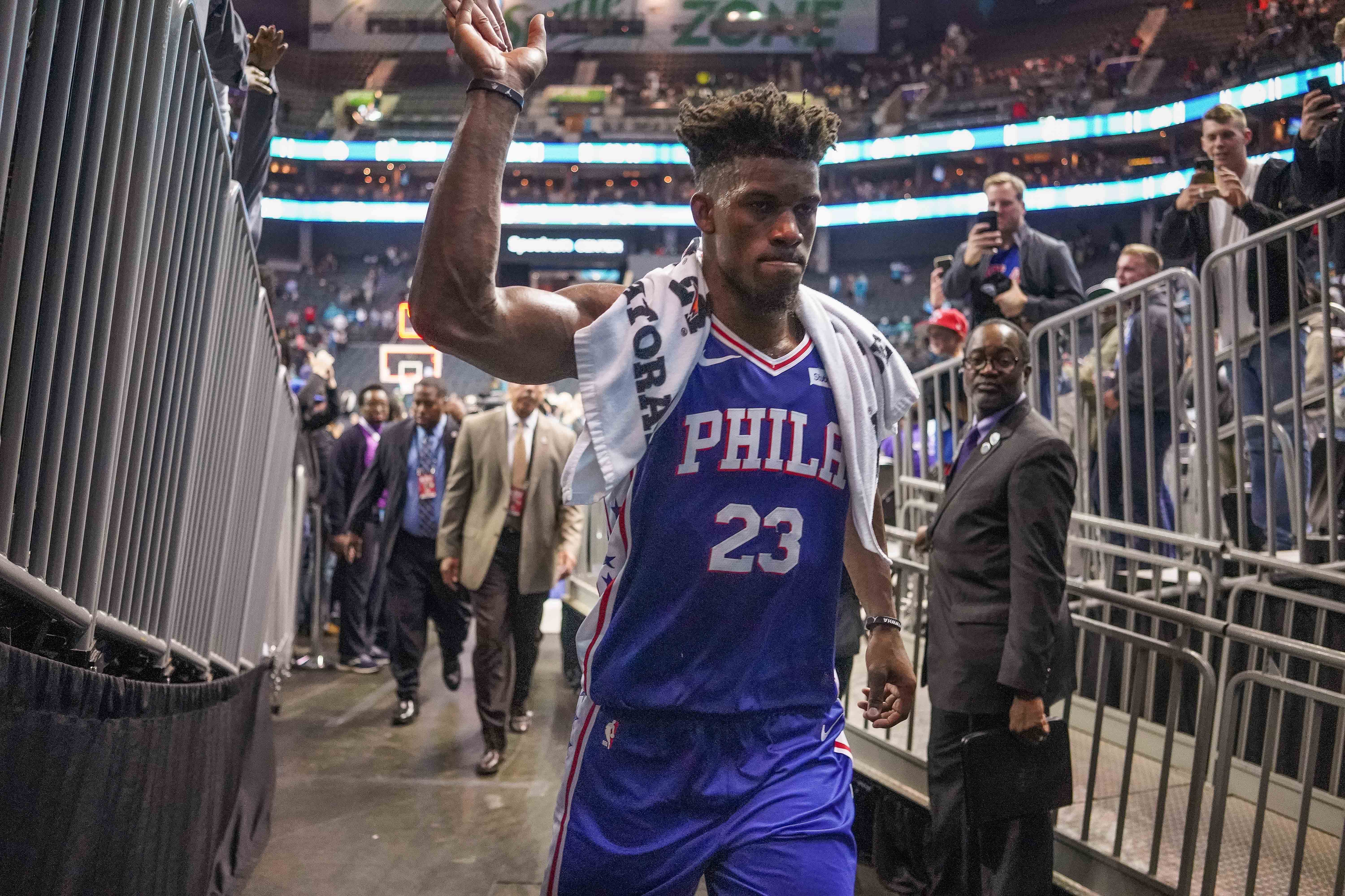 Nov 17, 2018; Charlotte, NC, USA; Philadelphia 76ers guard Jimmy Butler (23) heads to the locker room as fans high five after an overtime win against the Charlotte Hornets at Spectrum Center. Mandatory Credit: Jim Dedmon-USA TODAY Sports / Jim Dedmon