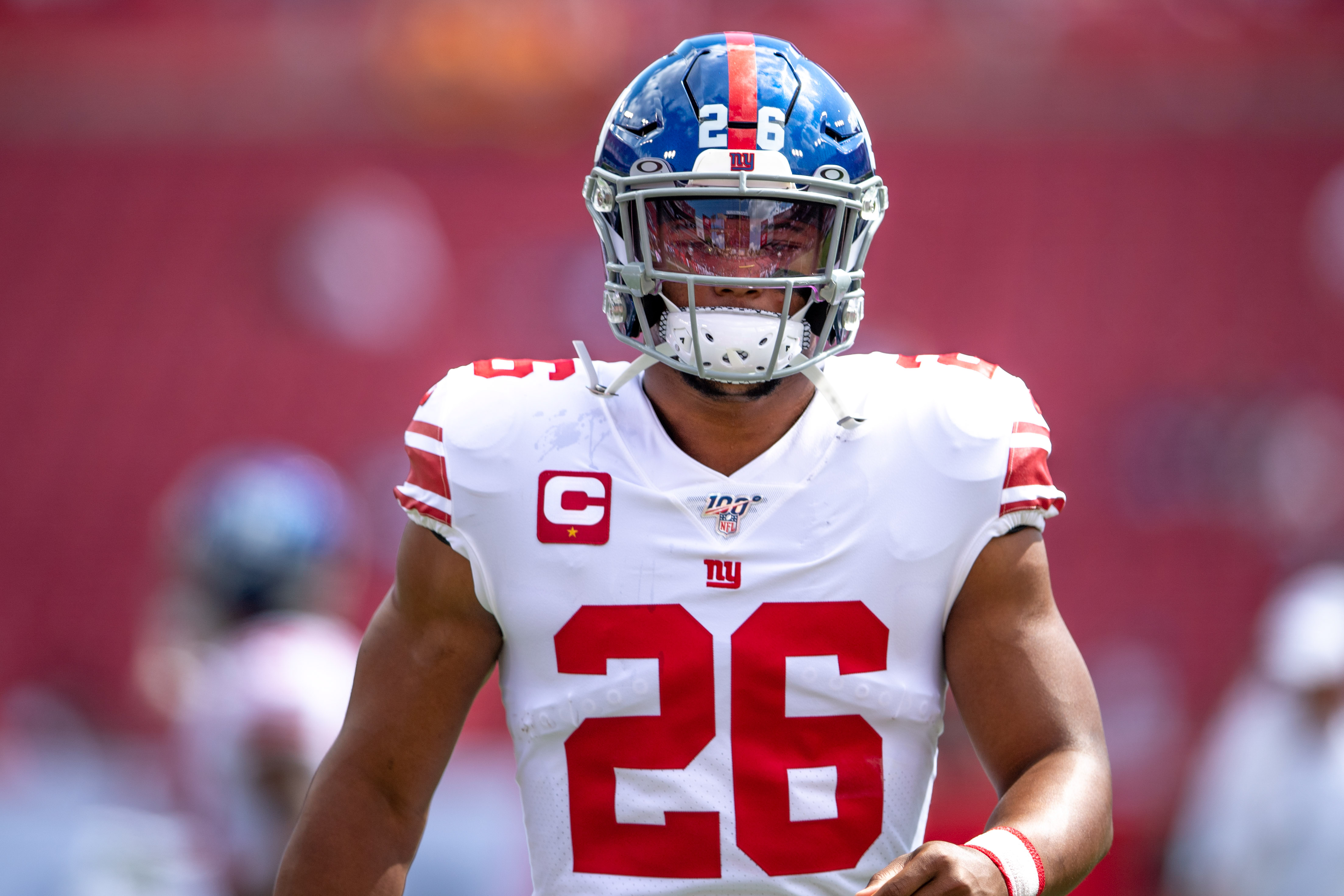 Sep 22, 2019; Tampa, FL, USA; New York Giants running back Saquon Barkley (26) walks on the field prior to the game between the Tampa Bay Buccaneers and the New York Giants at Raymond James Stadium. Mandatory Credit: Douglas DeFelice-USA TODAY Sports / Douglas DeFelice