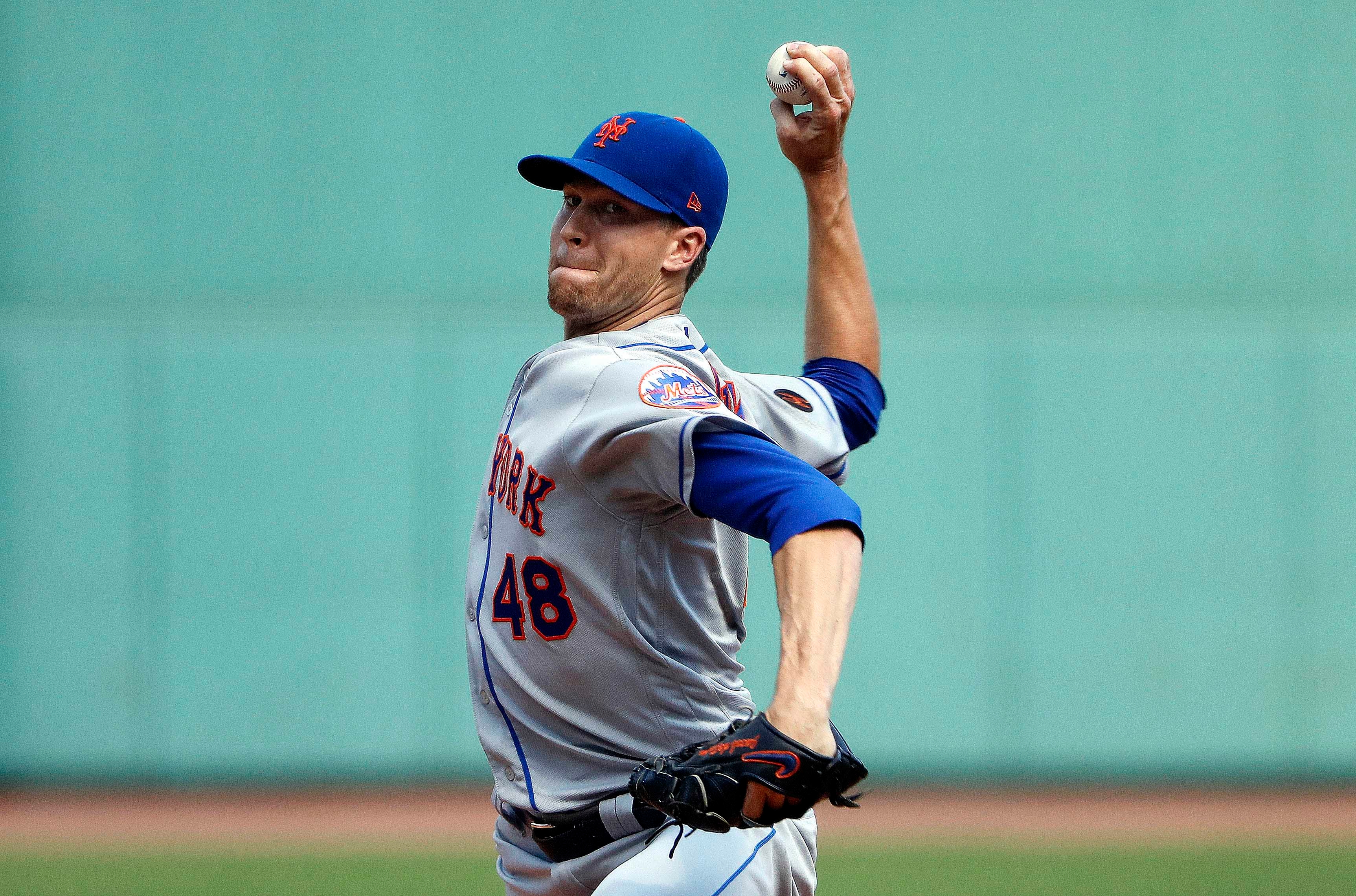 Sep 16, 2018; Boston, MA, USA; New York Mets starting pitcher Jacob deGrom (48) delivers against the Boston Red Sox during the first inning at Fenway Park. Mandatory Credit: Winslow Townson-USA TODAY Sports / Winslow Townson
