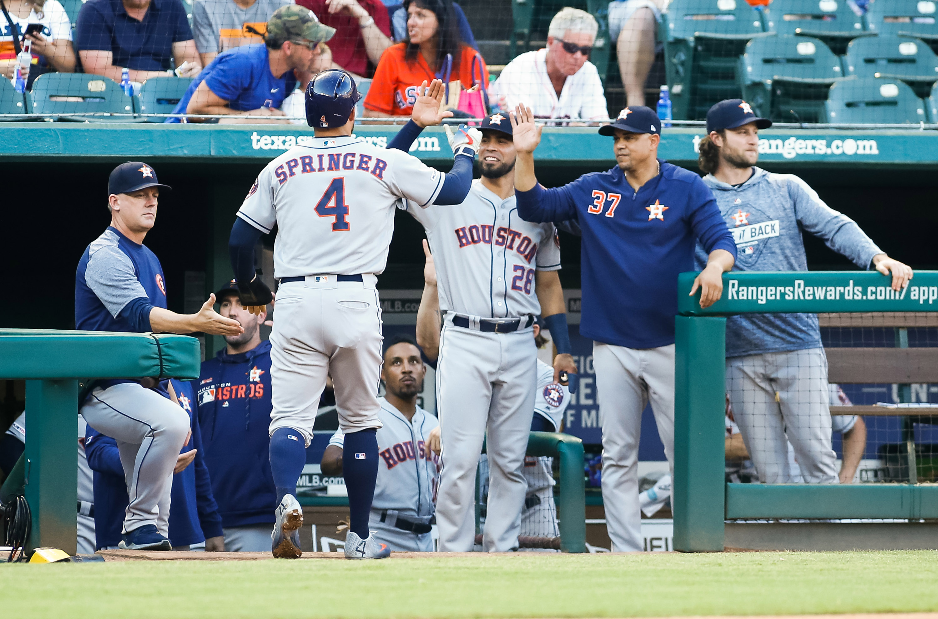 Jul 13, 2019; Arlington, TX, USA; Houston Astros center fielder George Springer (4) celebrates with center fielder Myles Straw (26) and hitting coach Alex Cintron (37) after scoring during the first inning against the Texas Rangers at Globe Life Park in Arlington. Mandatory Credit: Ray Carlin-USA TODAY Sports / Raymond Carlin III