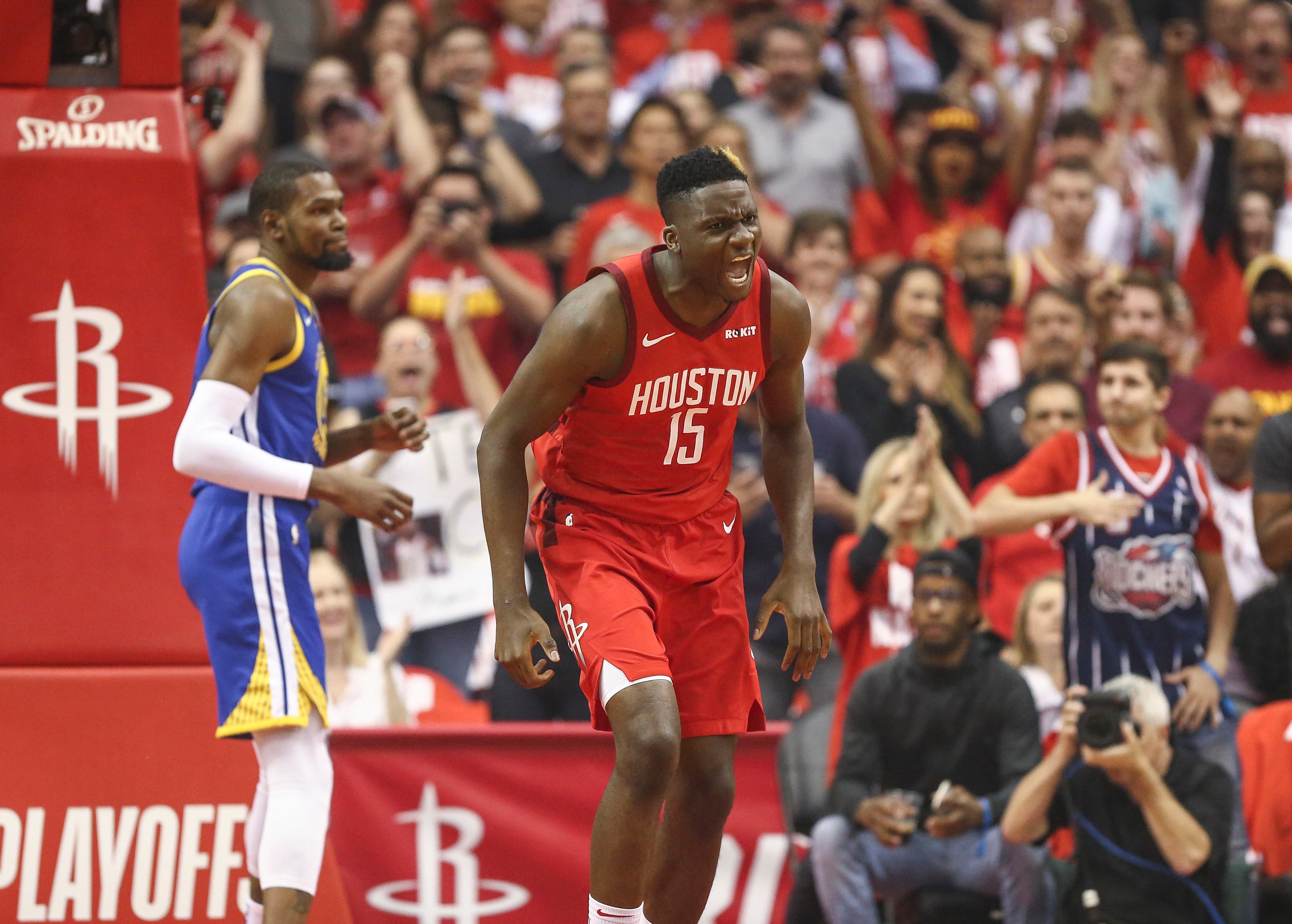 May 6, 2019; Houston, TX, USA; Houston Rockets center Clint Capela (15) reacts after scoring during the first quarter against the Golden State Warriors in game four of the second round of the 2019 NBA Playoffs at Toyota Center. Mandatory Credit: Troy Taormina-USA TODAY Sports / Troy Taormina