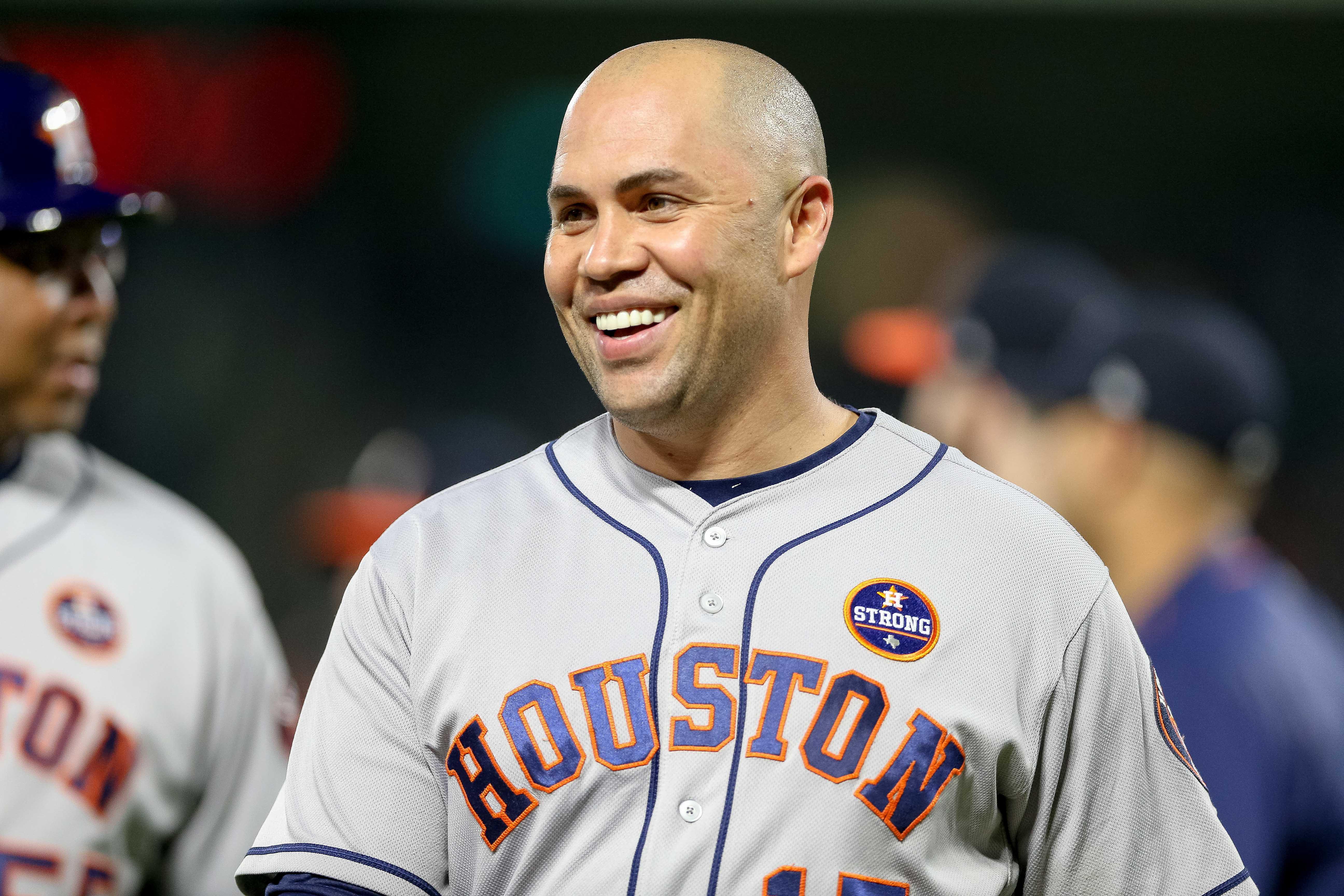 Sep 25, 2017; Arlington, TX, USA; Houston Astros designated hitter Carlos Beltran (15) smiles after the benches clear during the second inning against the Texas Rangers at Globe Life Park in Arlington. Mandatory Credit: Andrew Dieb-USA TODAY Sports / Andrew Dieb