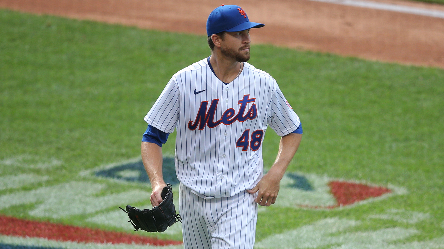 Jul 24, 2020; New York City, New York, USA; New York Mets starting pitcher Jacob deGrom (48) walks off the field during the fifth inning of an opening day game against the Atlanta Braves at Citi Field. The fifth would be his last inning. / Brad Penner-USA TODAY Sports