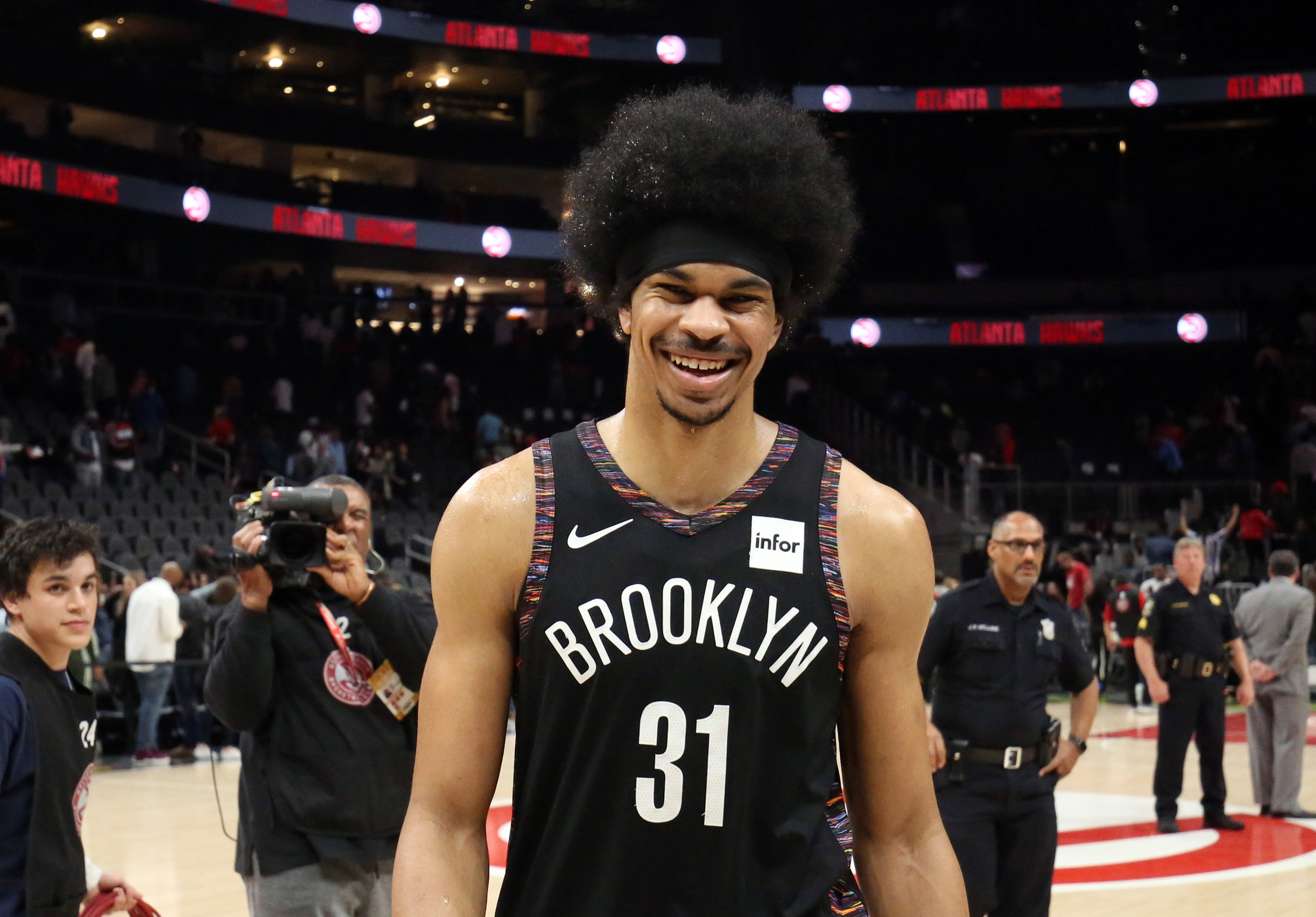 Mar 9, 2019; Atlanta, GA, USA; Brooklyn Nets center Jarrett Allen (31) reacts after their win against the Atlanta Hawks at State Farm Arena. Mandatory Credit: Jason Getz-USA TODAY Sports / Jason Getz