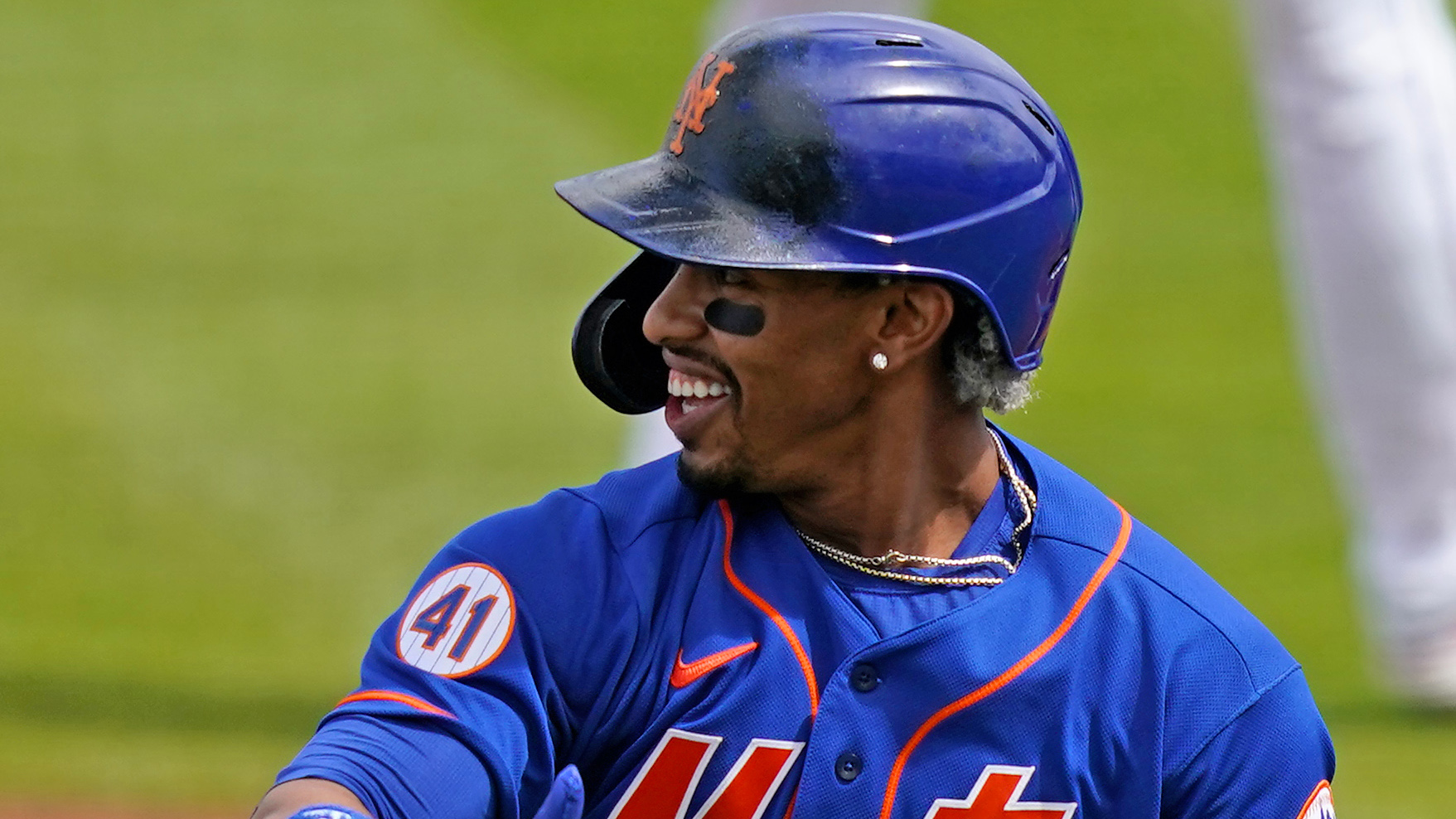 Mar 8, 2021; West Palm Beach, Florida, USA; New York Mets shortstop Francisco Lindor (12) reacts after his fly ball was caught by Washington Nationals center fielder Victor Robles (16, not pictured) in the 1st inning of the spring training game at The Ballpark of the Palm Beaches. / Jasen Vinlove-USA TODAY Sports