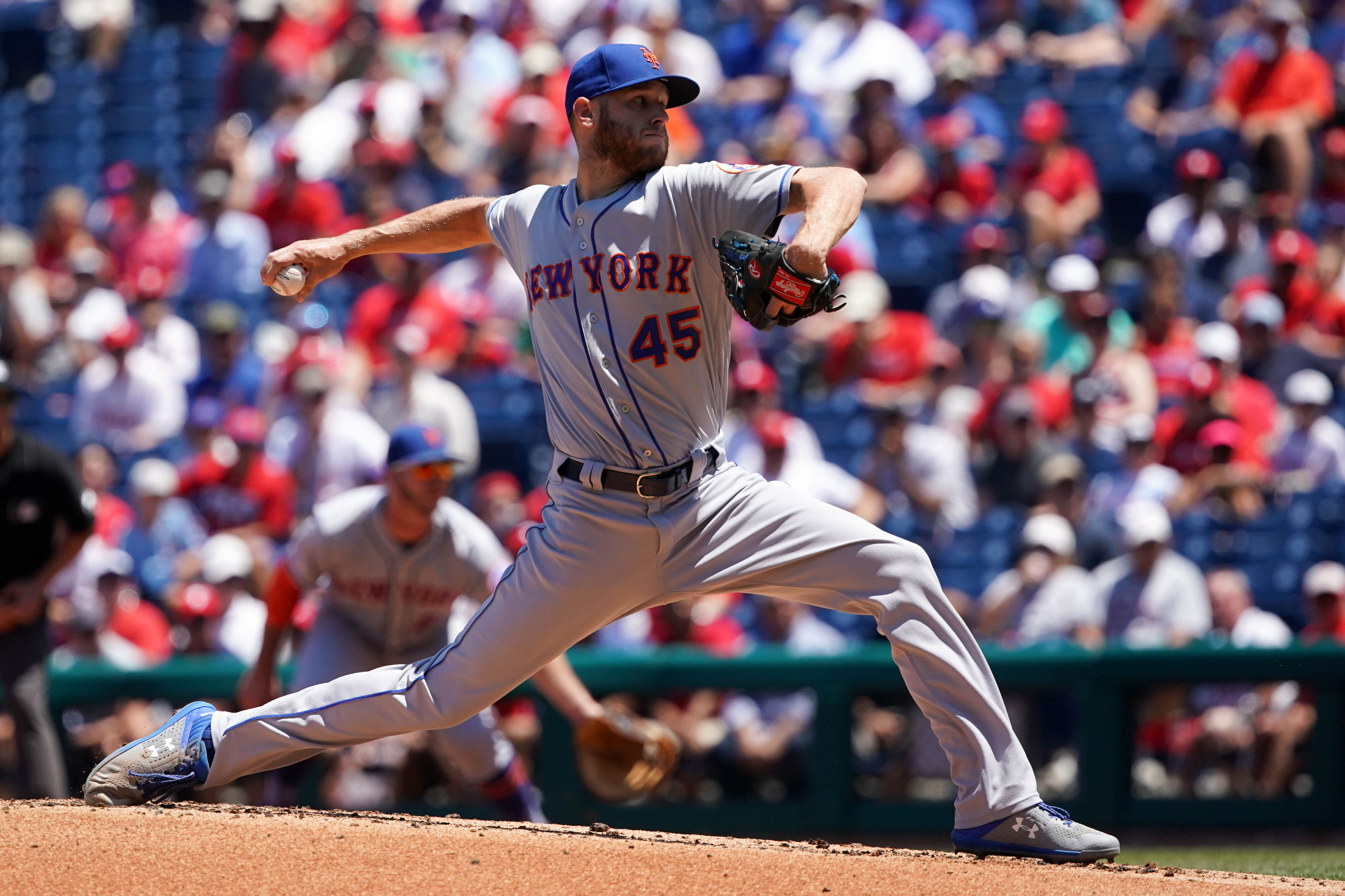 Jun 27, 2019; Philadelphia, PA, USA; New York Mets starting pitcher Zack Wheeler (45) pitches during the first inning against the Philadelphia Phillies at Citizens Bank Park. Mandatory Credit: Bill Streicher-USA TODAY Sports / Bill Streicher