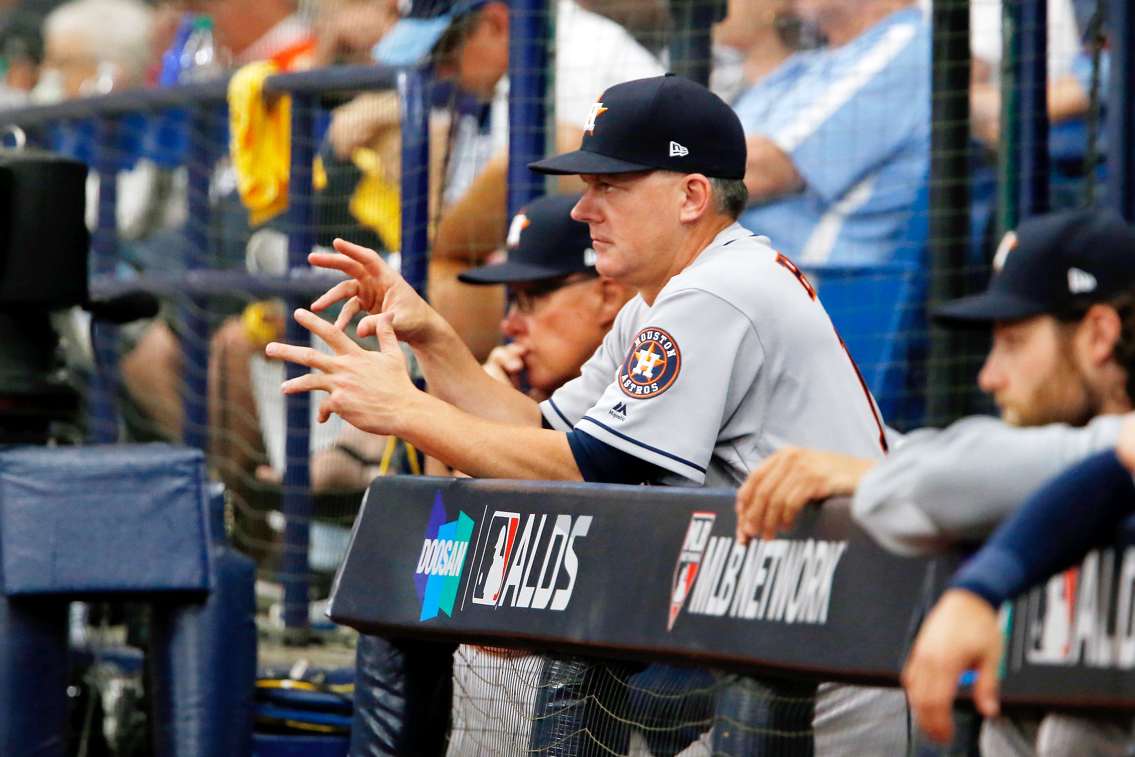 Oct 7, 2019; St. Petersburg, FL, USA; Houston Astros manager AJ Hinch (14) gestures while in the dugout during the seventh inning against the Tampa Bay Rays in game three of the 2019 ALDS playoff baseball series at Tropicana Field. Mandatory Credit: Reinhold Matay-USA TODAY Sports / Reinhold Matay