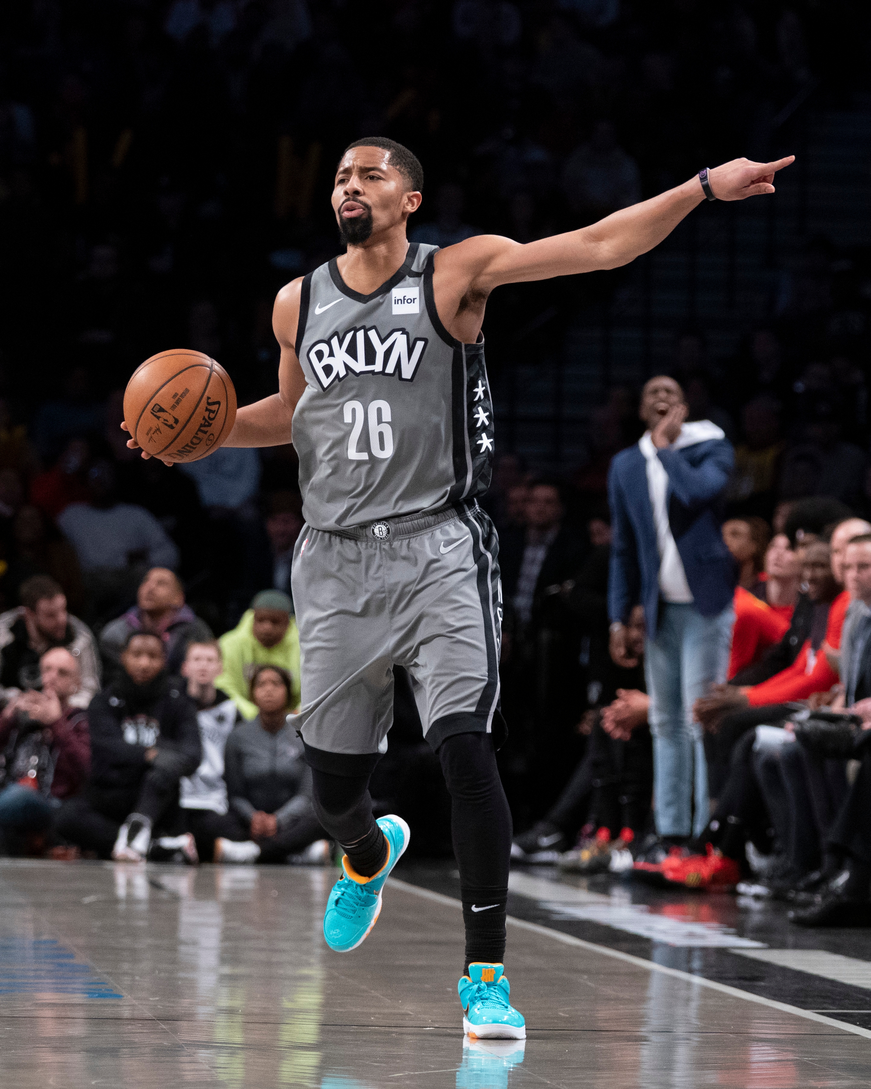 Jan 29, 2020; Brooklyn, New York, USA; Brooklyn Nets point guard Spencer Dinwiddie (8) dribbles the ball and gives direction against the Detroit Pistons during the second half at Barclays Center. Mandatory Credit: Gregory Fisher-USA TODAY Sports / Gregory Fisher