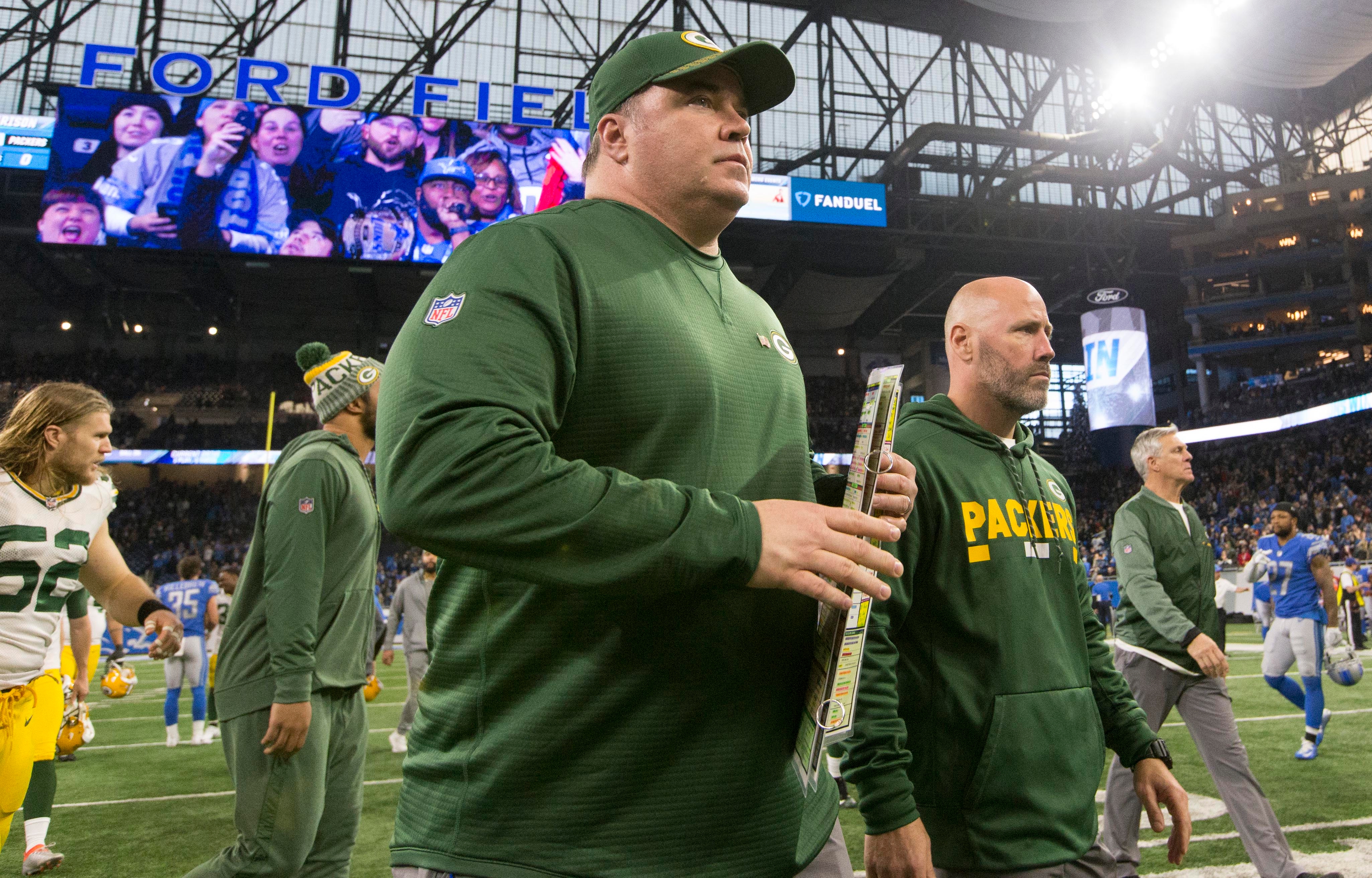 Dec 31, 2017; Detroit, MI USA; Green Bay Packers head coach Mike McCarthy (left) leaves the field their game against the Detroit Lions at Ford Field. Mandatory Credit: Mark Hoffman/Milwaukee Journal Sentinel via USA TODAY Sports / Mark Hoffman