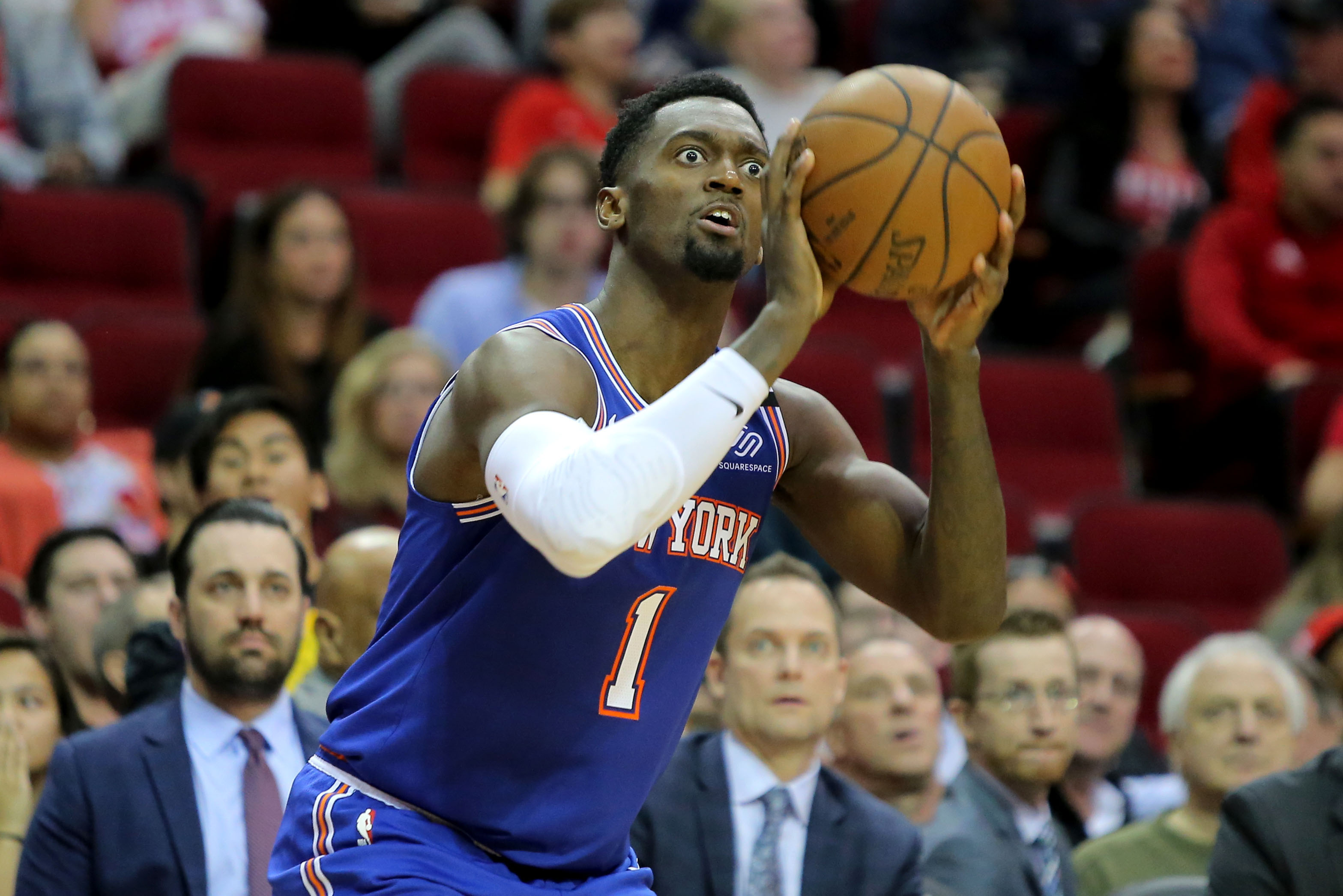 Feb 24, 2020; Houston, Texas, USA; New York Knicks forward Bobby Portis (1) takes a three-point shot against the Houston Rockets during the third quarter at Toyota Center. Mandatory Credit: Erik Williams-USA TODAY Sports / Erik Williams