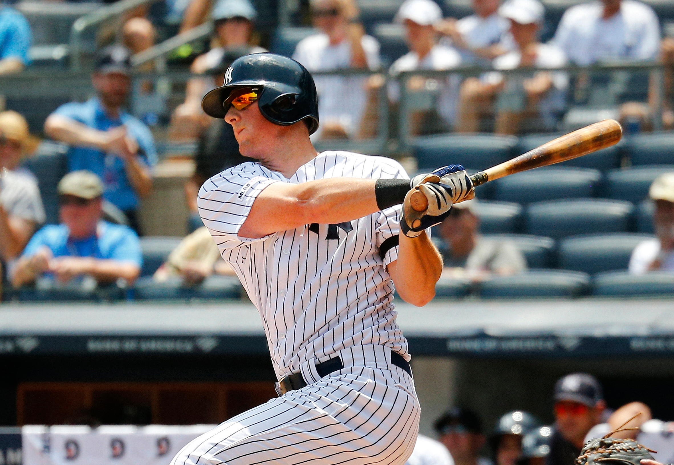 Jul 20, 2019; Bronx, NY, USA New York Yankees third baseman DJ LeMahieu (26) singles against the Colorado Rockies during the first inning at Yankee Stadium. Mandatory Credit: Andy Marlin-USA TODAY Sports / Andy Marlin