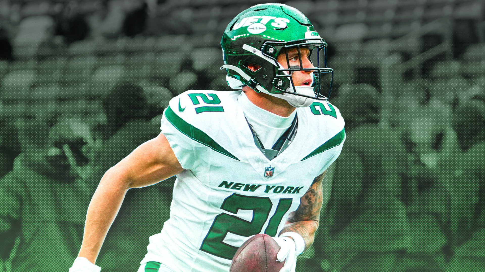 Jan 7, 2024; Foxborough, Massachusetts, USA; New York Jets safety Ashtyn Davis (21) intercepts a pass intended for New England Patriots wide receiver Jalen Reagor (83) in the second half at Gillette Stadium. / David Butler II-USA TODAY Sports