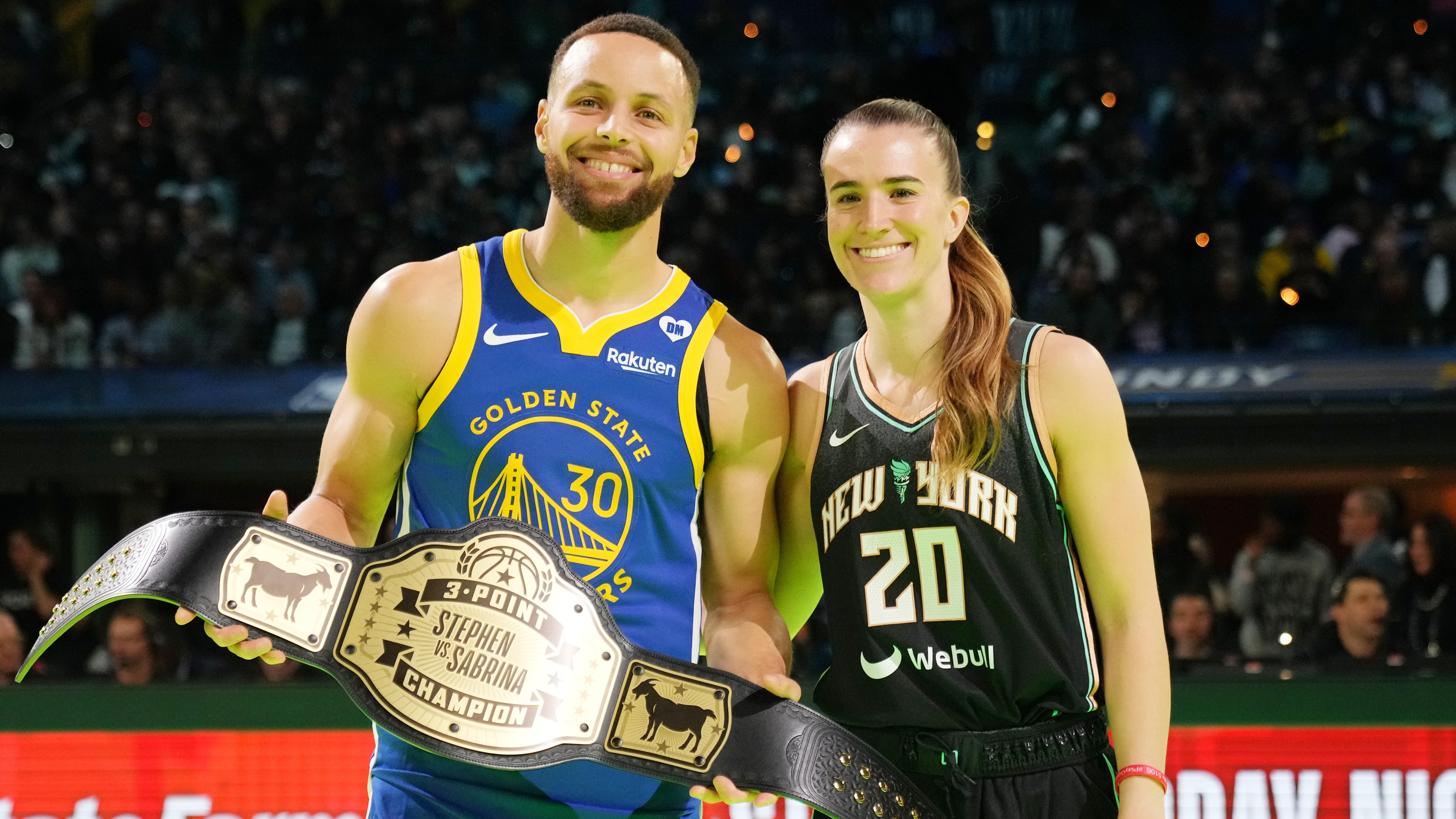 Liberty's Sabrina Ionescu falls to Golden State's Steph Curry in All-Star Three-Point challengeThis is the first time a WNBA and NBA star went head-to-head in this event2/18/2024, 3:10 AMJohn FlaniganFreelance Editorial ProducerGolden State Warriors guard Stephen Curry (30) and New York Liberty guard Sabrina Ionescu (20) after the Stephen vs Sebrina three-point challenge during NBA All Star Saturday Night at Lucas Oil Stadium / Kyle Terada - USA TODAY Sports