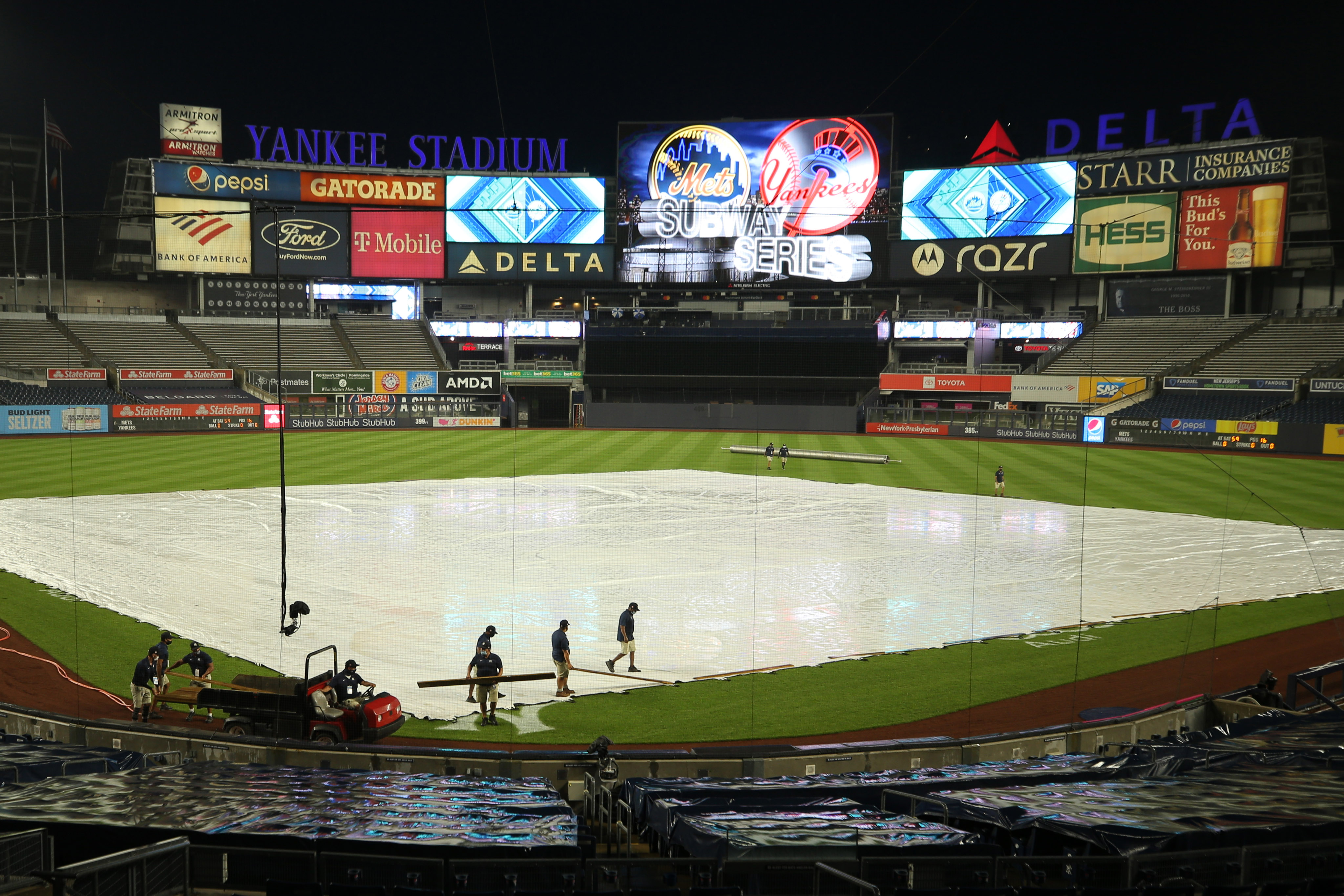 Friday's Subway Series matchup between Mets and Yankees postponed due to rainGame will be made up as split doubleheader on Sunday7/3/2021, 12:44 AMAlex SmithEditorial ProducerGrounds crew members remove the tarp from the infield after a rain delay before the start of the second game of a double header between the New York Yankees and the New York Mets at Yankee Stadium. / Brad Penner-USA TODAY Sports