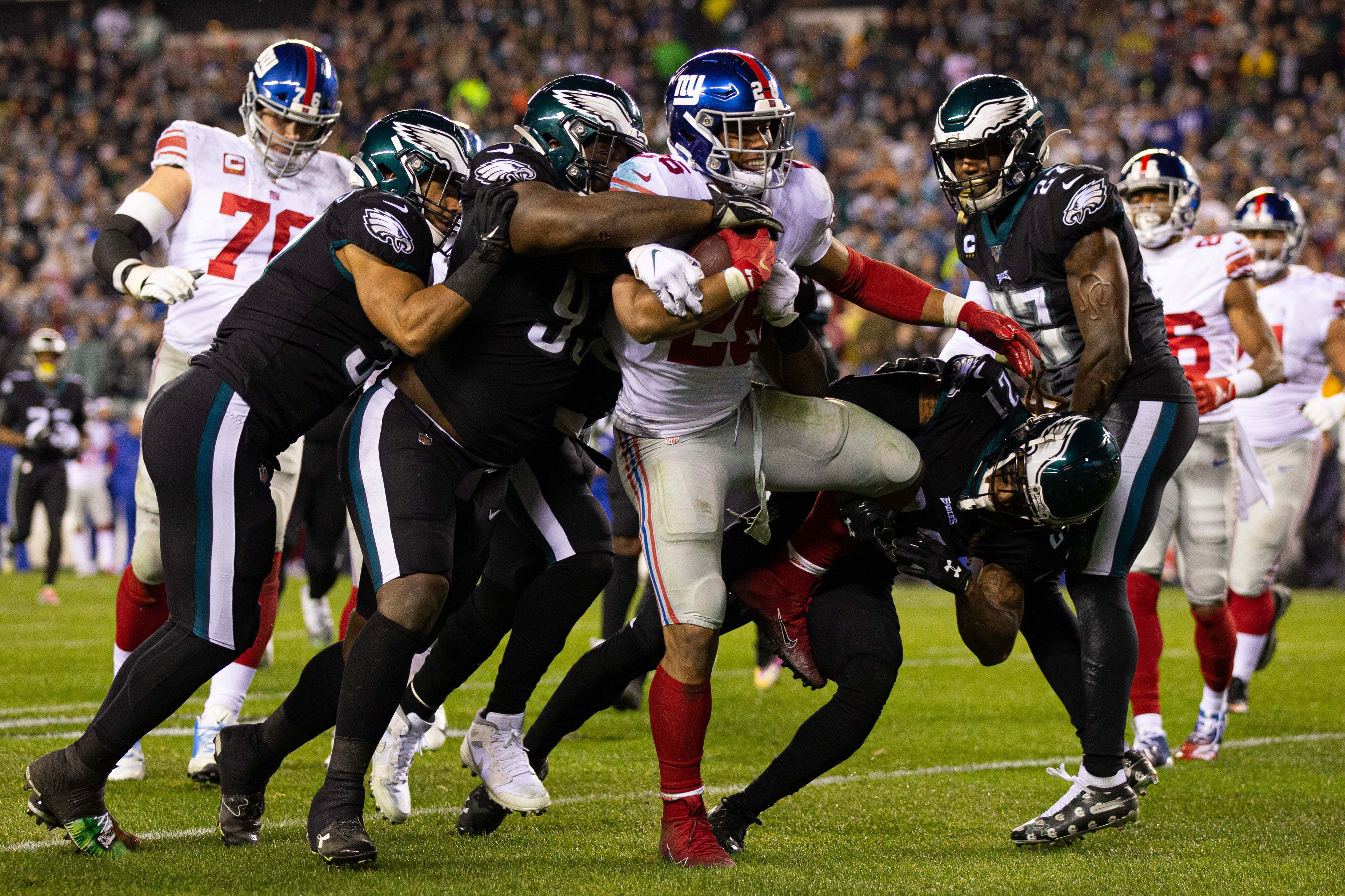Dec 9, 2019; Philadelphia, PA, USA; New York Giants running back Saquon Barkley (26) runs with the ball and is tackled by the Philadelphia Eagles during the second quarter at Lincoln Financial Field. Mandatory Credit: Bill Streicher-USA TODAY Sports / Bill Streicher