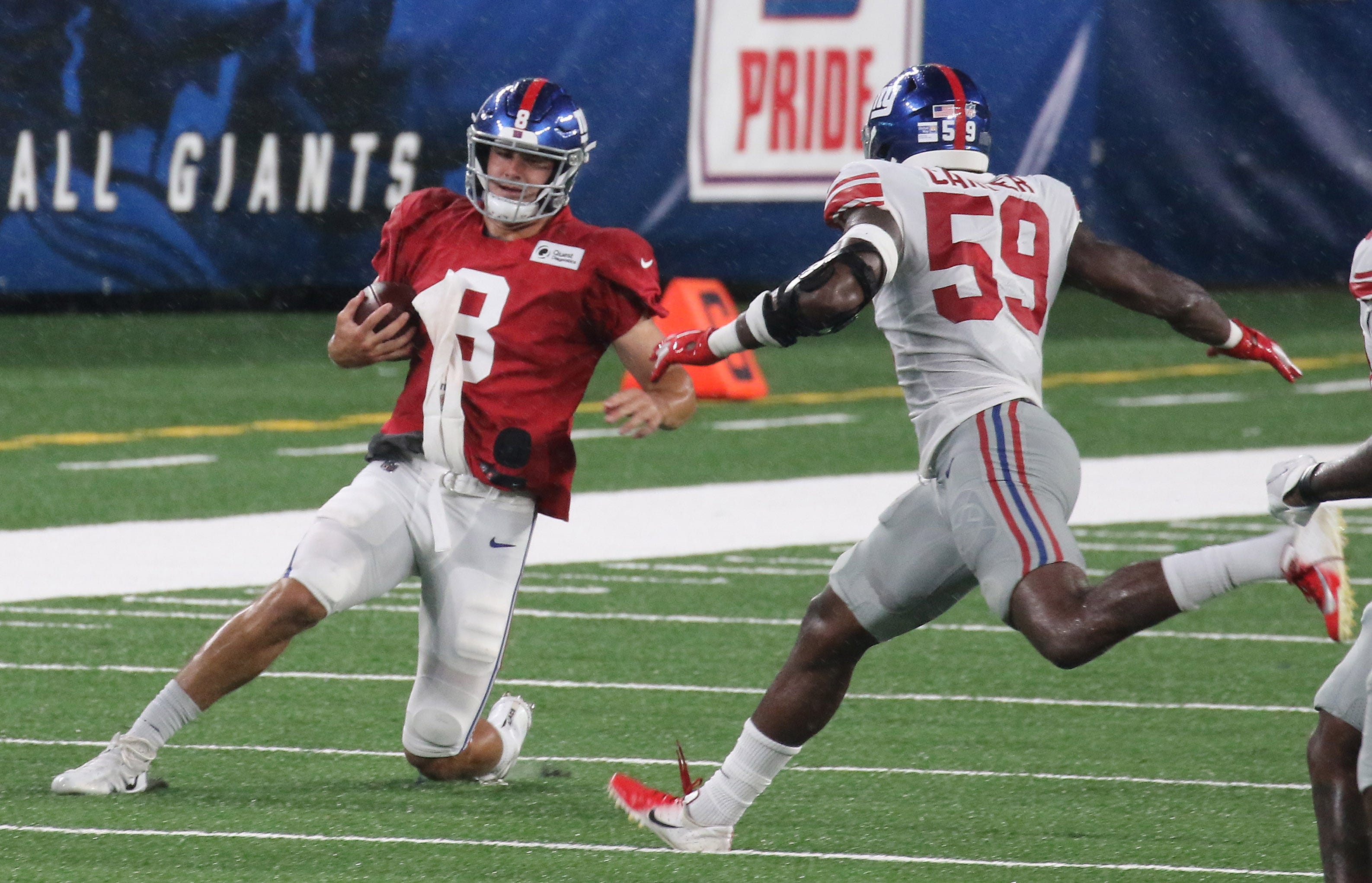 Takeaways from Giants' Blue-White scrimmage, including Lorenzo Carter's dominanceCarter's play highlighted a strong showing by the defensive line8/29/2020, 1:40 AMRalph VacchianoNFL InsiderLorenzo Carter chases quarterback Daniel Jones while Jones slides for yardage as the New York Giants play an inter-sqaud game, the Blue White scrimmage at MetLife Stadium on August 28 2020. The New York Giants Play An Inter Sqaud Game The Blue White Scrimmage At Metlife Stadium On August 28 2020© Chris Pedota, NorthJersey.com via Imagn Content Services, LLC / © Chris Pedota, NorthJersey.com via Imagn Content Services, LLC