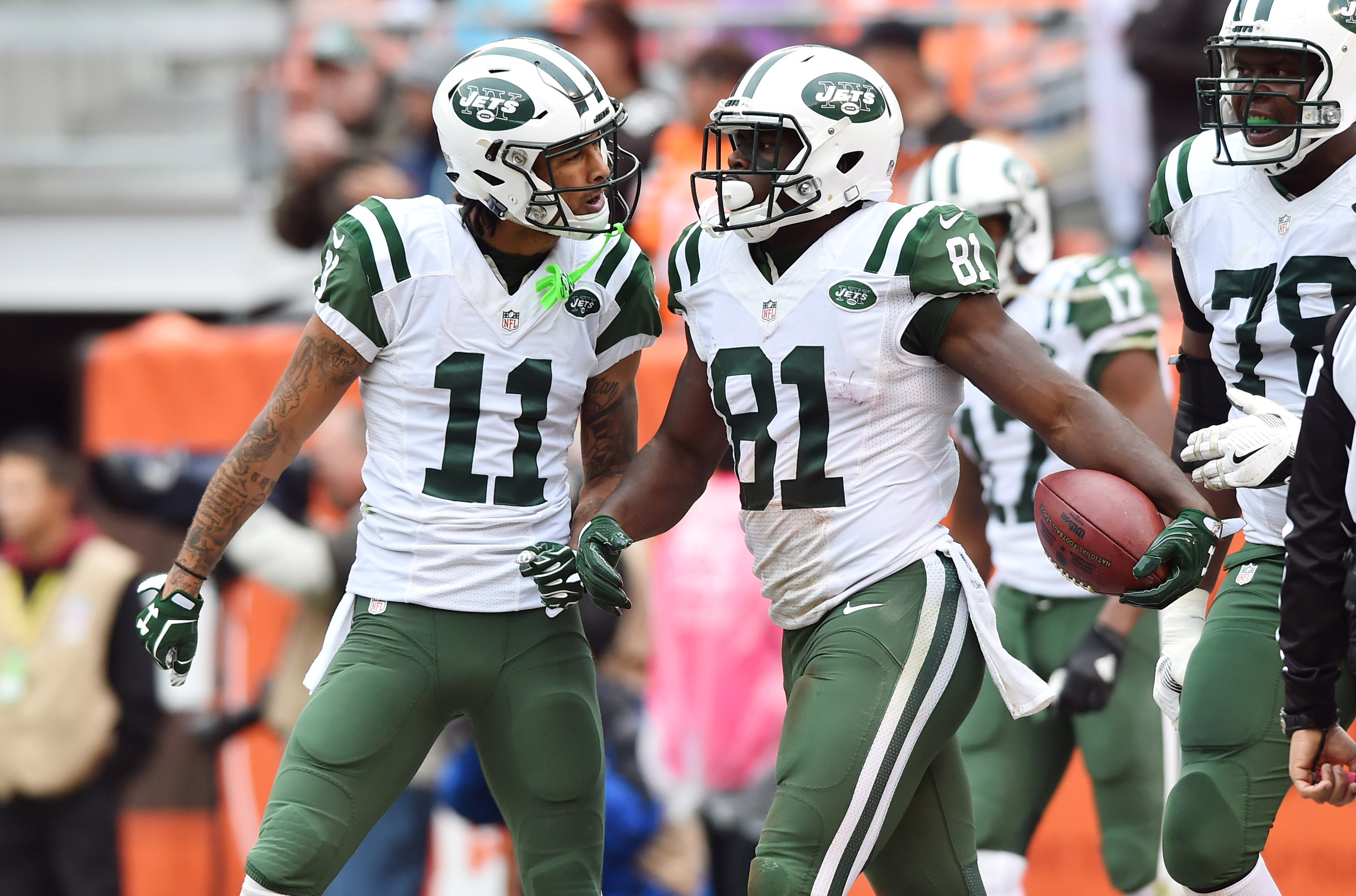 New York Jets wide receiver Robby Anderson (11) celebrates with wide receiver Quincy Enunwa (81) after Enunwa scored a touchdown against the Cleveland Browns during the second half at FirstEnergy Stadium. / Ken Blaze