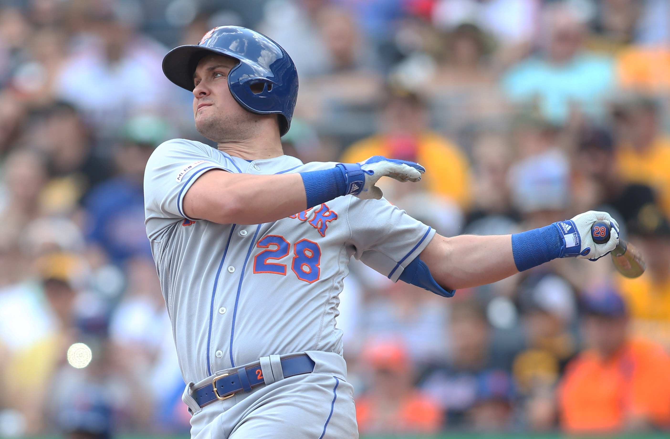 Aug 4, 2019; Pittsburgh, PA, USA; New York Mets left fielder J.D. Davis (28) hits an RBI single against the Pittsburgh Pirates during the third inning at PNC Park. Mandatory Credit: Charles LeClaire-USA TODAY Sports / Charles LeClaire