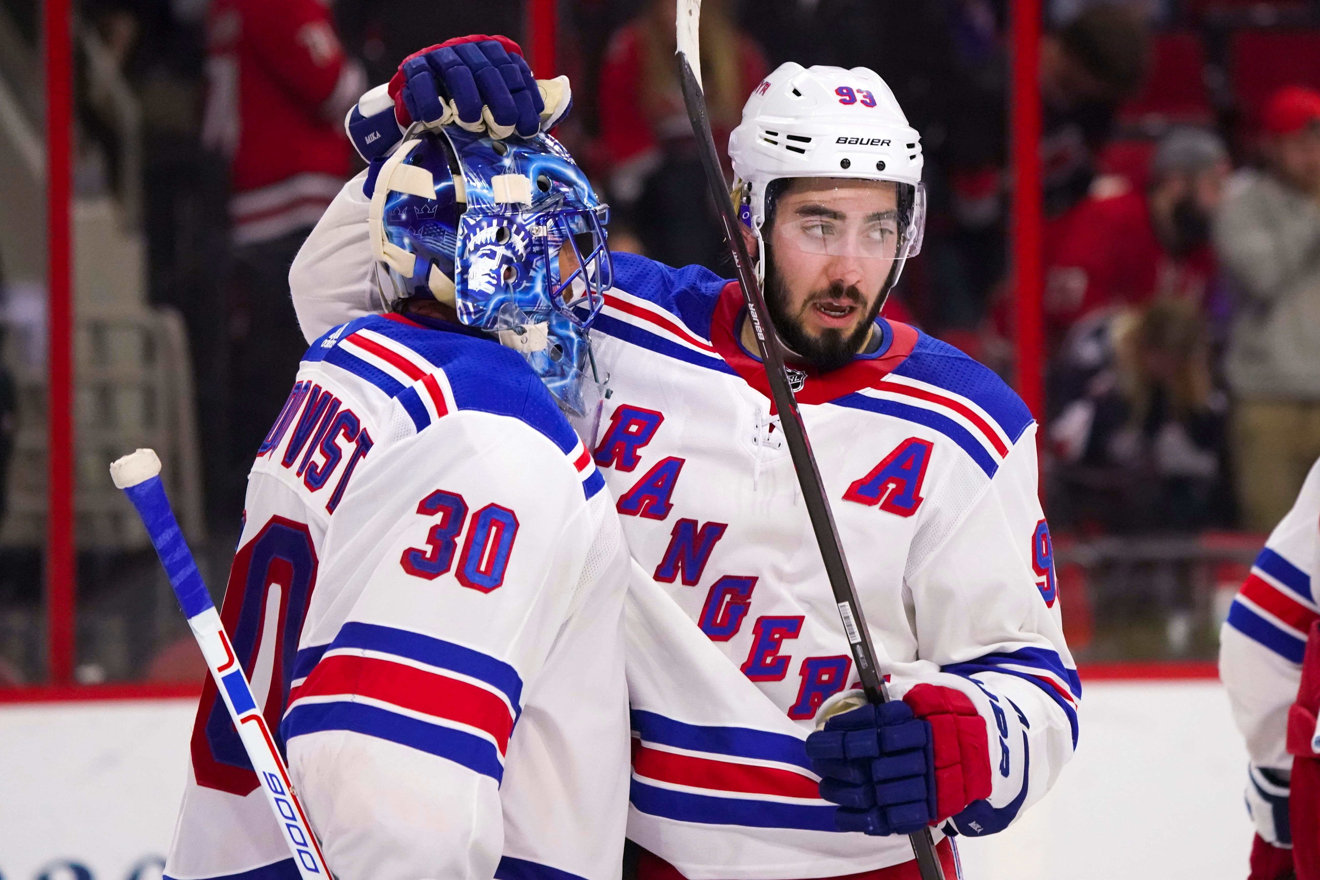 Mar 31, 2018; Raleigh, NC, USA; New York Rangers goalie Henrik Lundqvist (30) celebrates with forward Mika Zibanejad (93) after there win against the Carolina Hurricanes at PNC Arena. The New York Rangers defeated the Carolina Hurricanes 2-1. Mandatory Credit: James Guillory-USA TODAY Sports / James Guillory