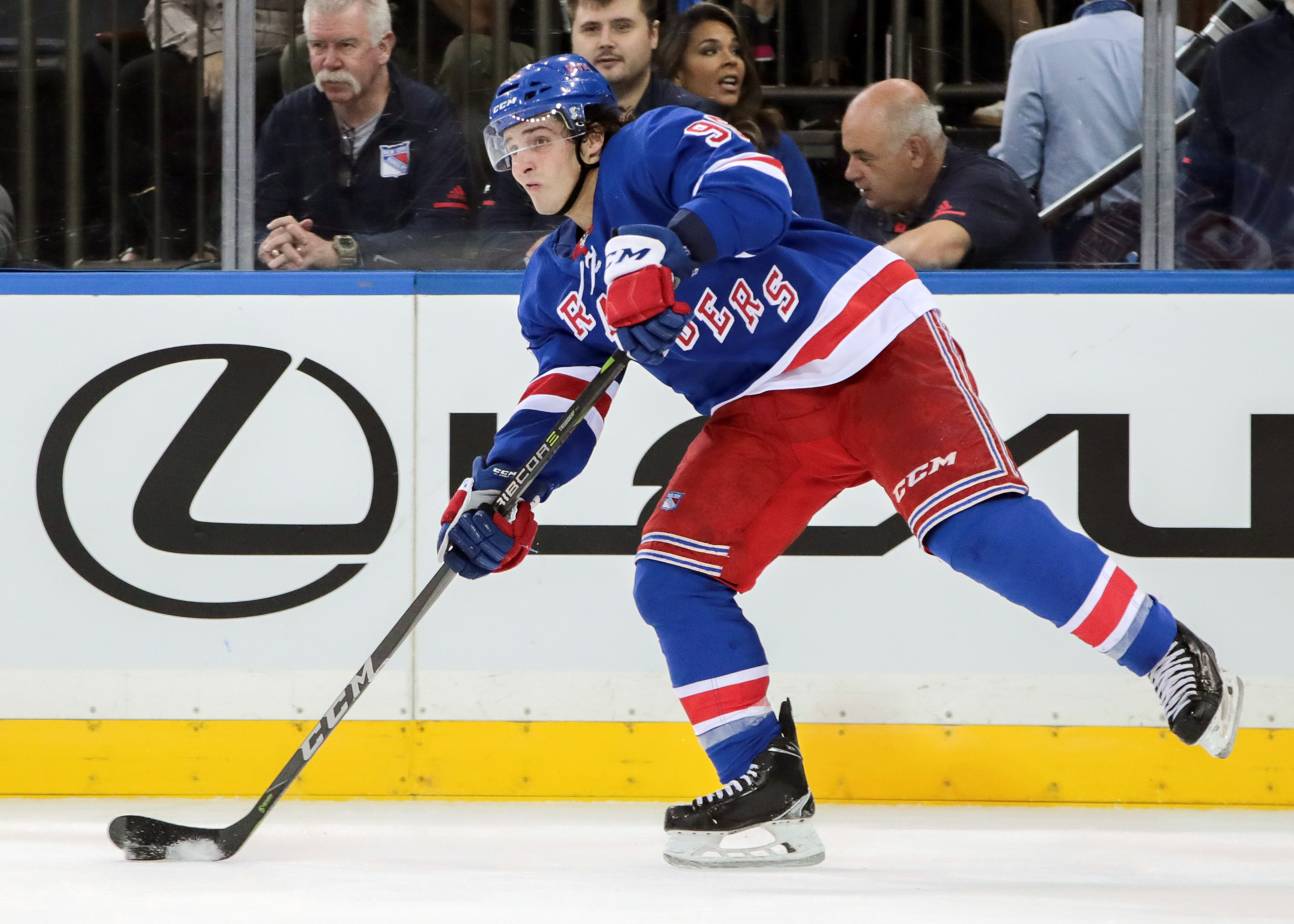 Sep 25, 2017; New York, NY, USA; New York Rangers center Vinni Lettieri (95) passes the puck against the Philadelphia Flyers during the first period at Madison Square Garden. Mandatory Credit: Vincent Carchietta-USA TODAY Sports / Vincent Carchietta