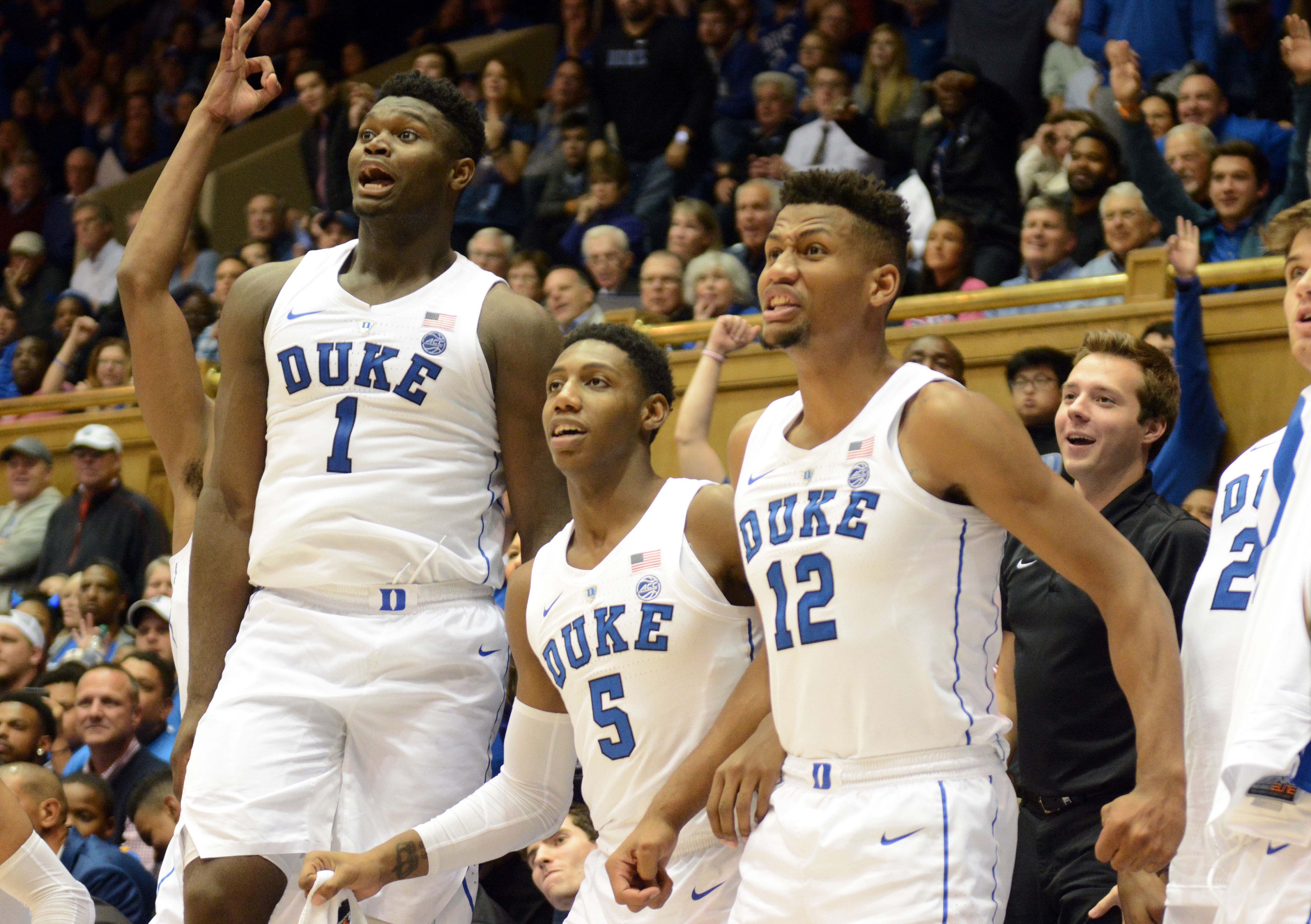 Nov 14, 2018; Durham, NC, USA; Duke Blue Devils forward Zion Williamson (1) forward R.J. Barrett (5) and forward Javin DeLaurier (12) react to a three pointer during the second half against the Eastern Michigan Eagles at Cameron Indoor Stadium. The Blue Devils won 84-46. Mandatory Credit: Rob Kinnan-USA TODAY Sports / Rob Kinnan