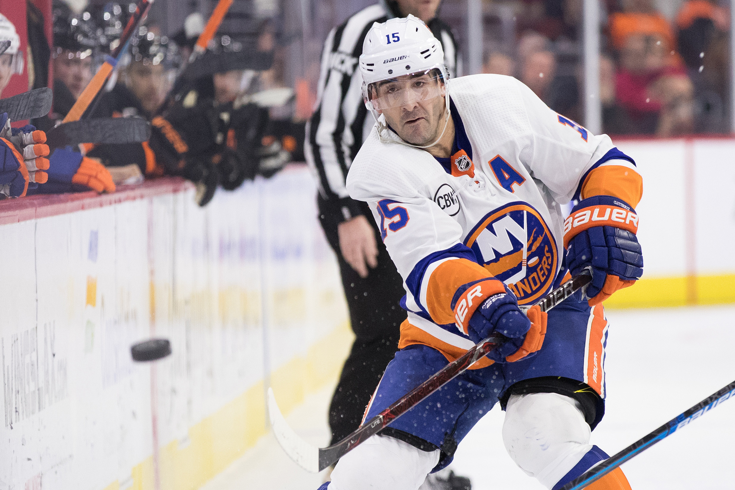Mar 23, 2019; Philadelphia, PA, USA; New York Islanders right wing Cal Clutterbuck (15) passes the puck against the Philadelphia Flyers during the second period at Wells Fargo Center. Mandatory Credit: Bill Streicher-USA TODAY Sports / Bill Streicher