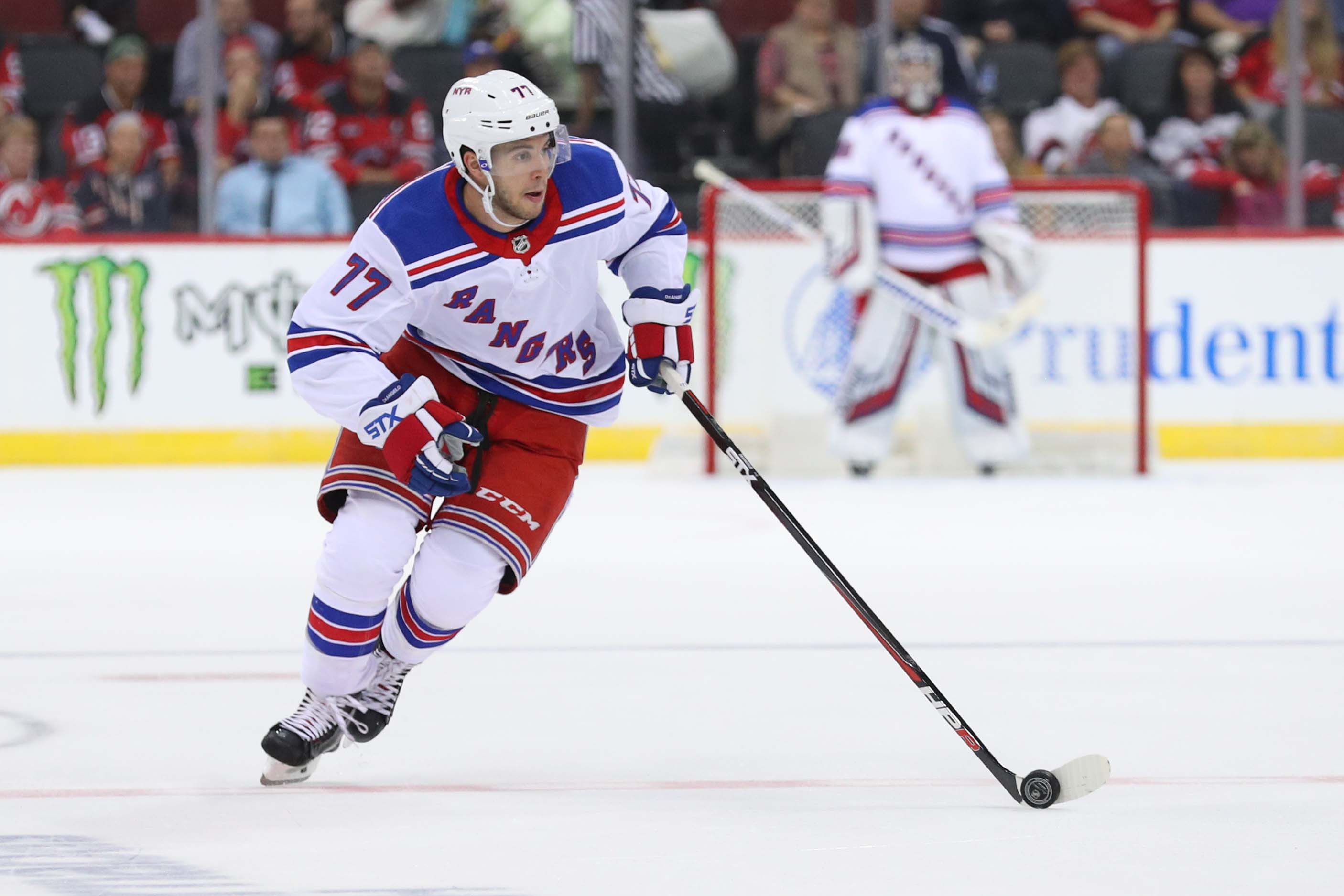Sep 17, 2018; Newark, NJ, USA; New York Rangers defenseman Tony DeAngelo (77) skates with the puck during the first period of their game against the New Jersey Devils at Prudential Center. Mandatory Credit: Ed Mulholland-USA TODAY Sports / Ed Mulholland