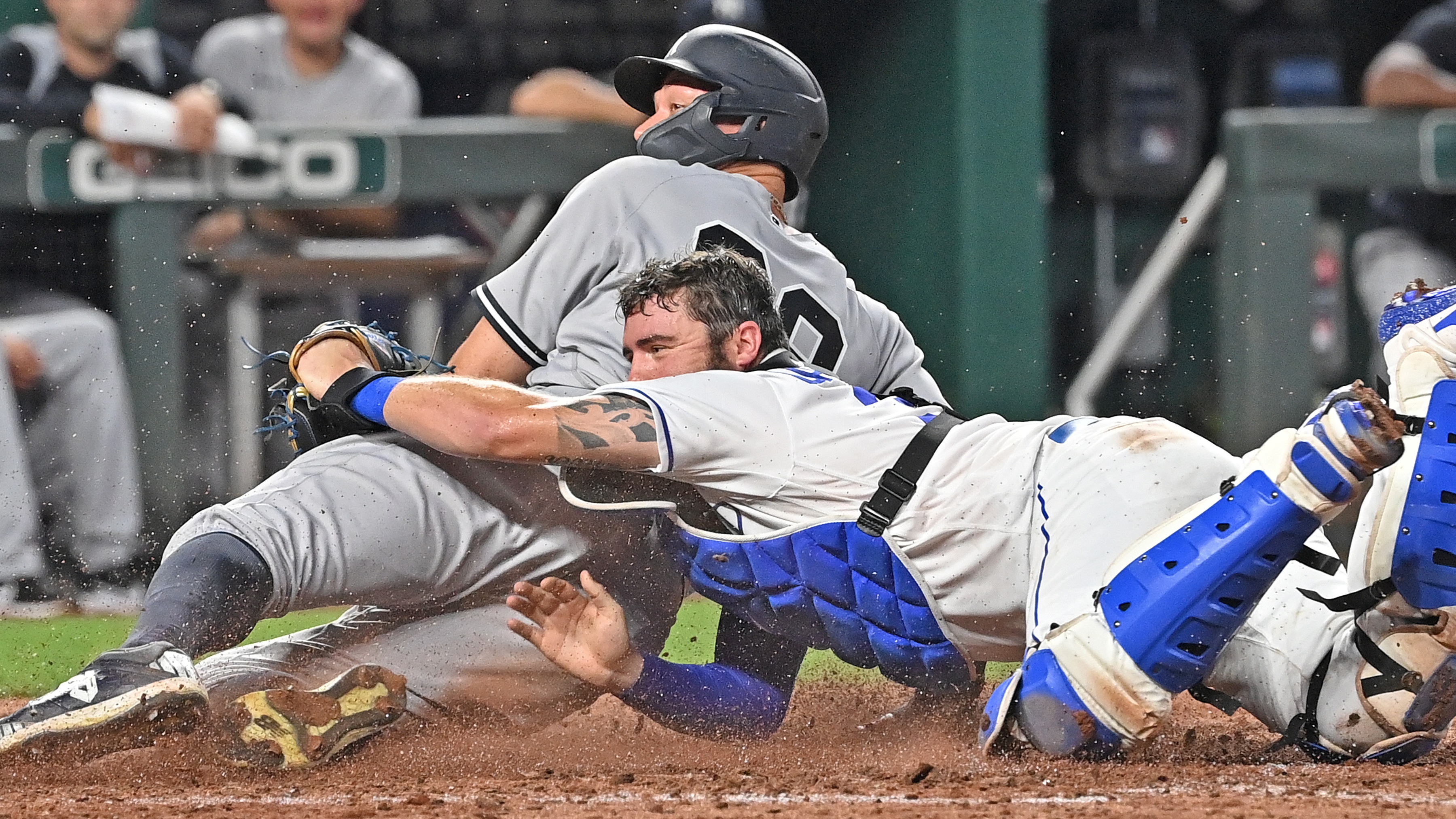 The Yankees are digging deep nowFour blown saves weren't enough to put this red hot team down8/10/2021, 5:29 AMAndy MartinoMLB InsiderAug 9, 2021; Kansas City, Missouri, USA; Kansas City Royals catcher Cam Gallagher (36) tags out New York Yankees right fielder Aaron Judge (99) at home plate during the seventh inning at Kauffman Stadium. / © Peter Aiken-USA TODAY SportsAug 9, 2021; Kansas City, Missouri, USA; New York Yankees first baseman Luke Voit (59) singles in a run against the Kansas City Royals during the seventh inning at Kauffman Stadium. / © Peter Aiken-USA TODAY Sports