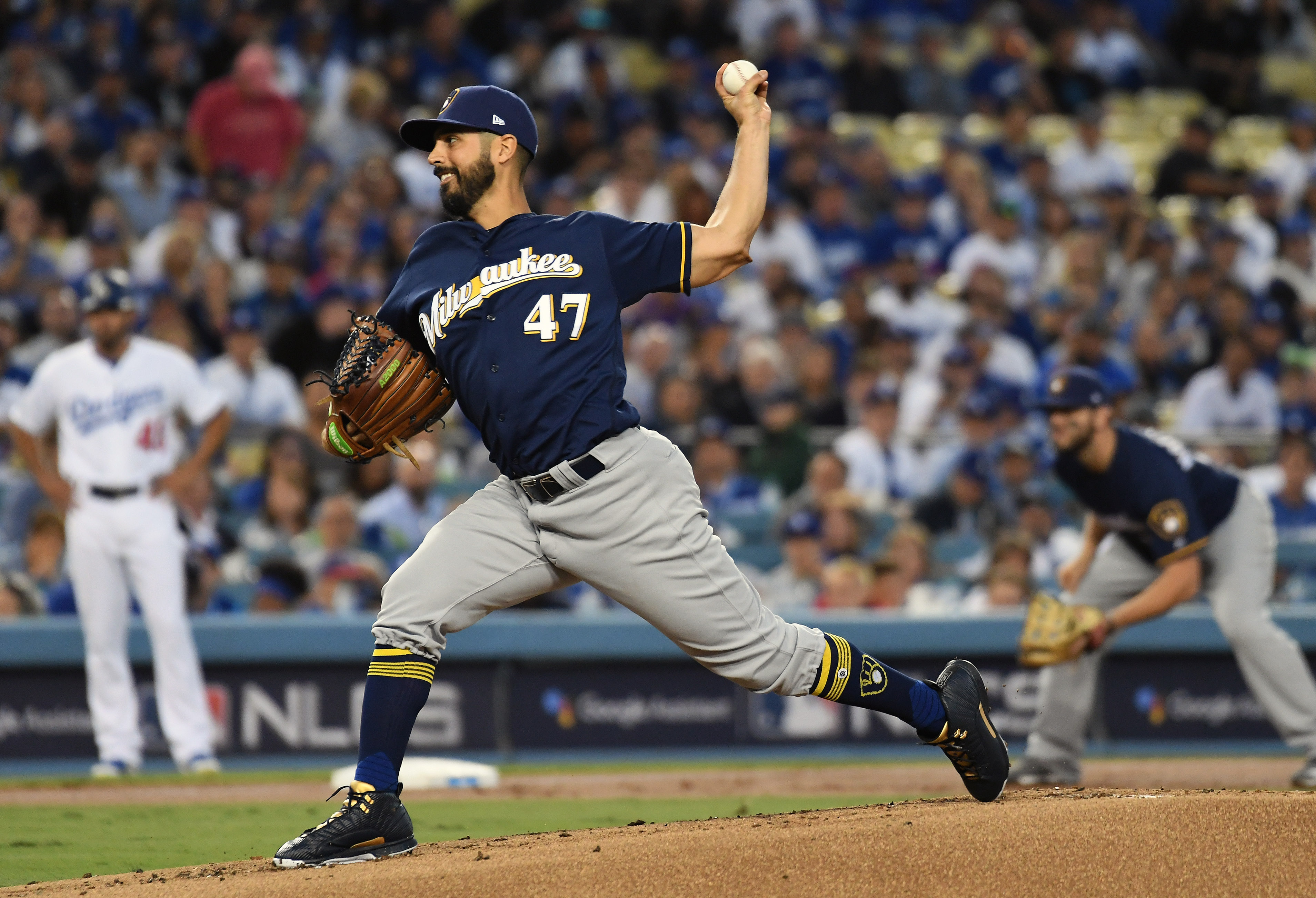 Oct 16, 2018; Los Angeles, CA, USA; Milwaukee Brewers starting pitcher Gio Gonzalez (47) pitches against the Los Angeles Dodgers in the first inning in game four of the 2018 NLCS playoff baseball series at Dodger Stadium. Mandatory Credit: Richard Mackson-USA TODAY Sports / Richard Mackson