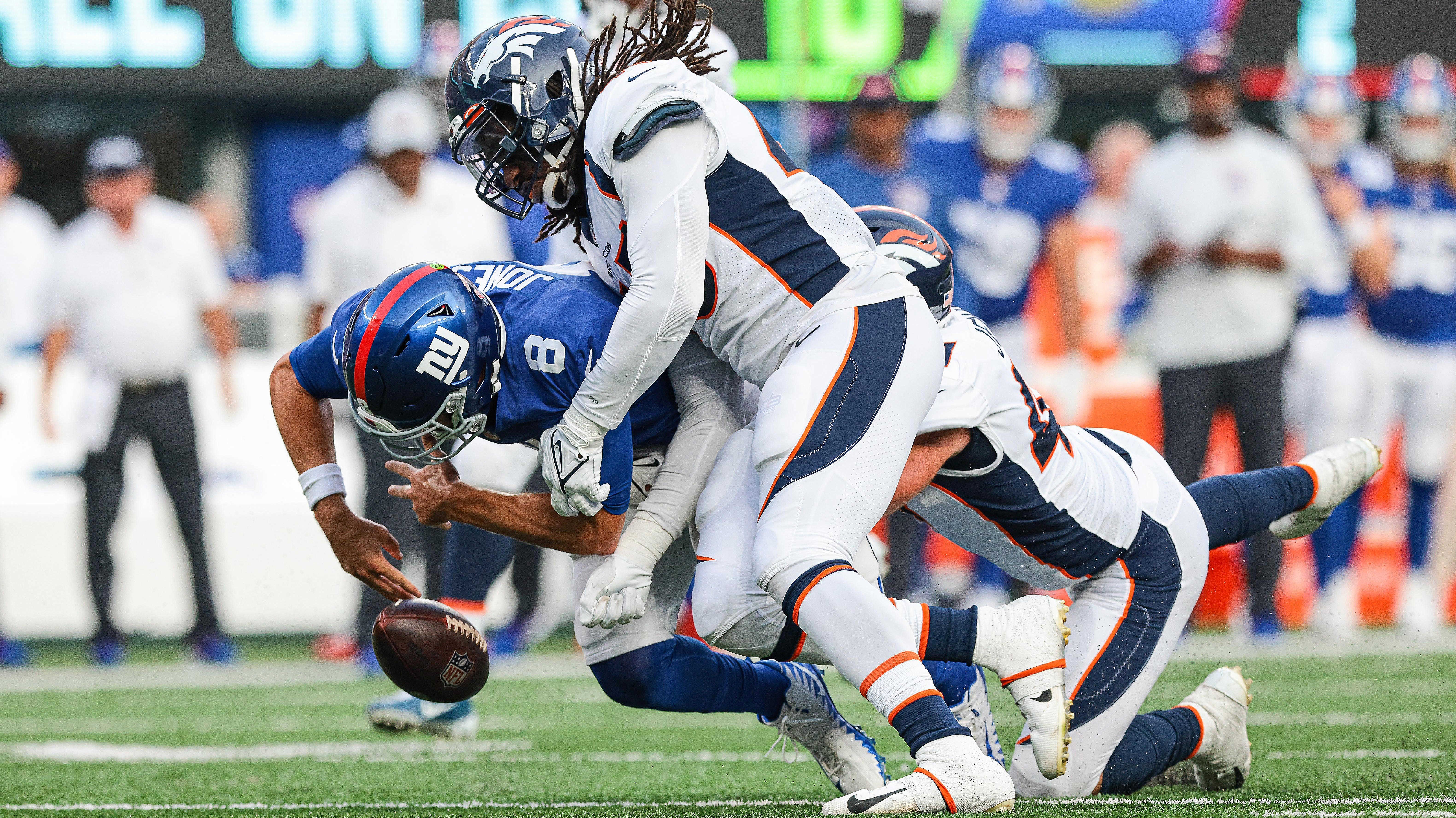 Sep 12, 2021; East Rutherford, New Jersey, USA; Denver Broncos linebacker A.J. Johnson (45) forces a fumble on New York Giants quarterback Daniel Jones (8) during the second half at MetLife Stadium. Mandatory Credit: Vincent Carchietta-USA TODAY Sports / Vincent Carchietta-USA TODAY Sports