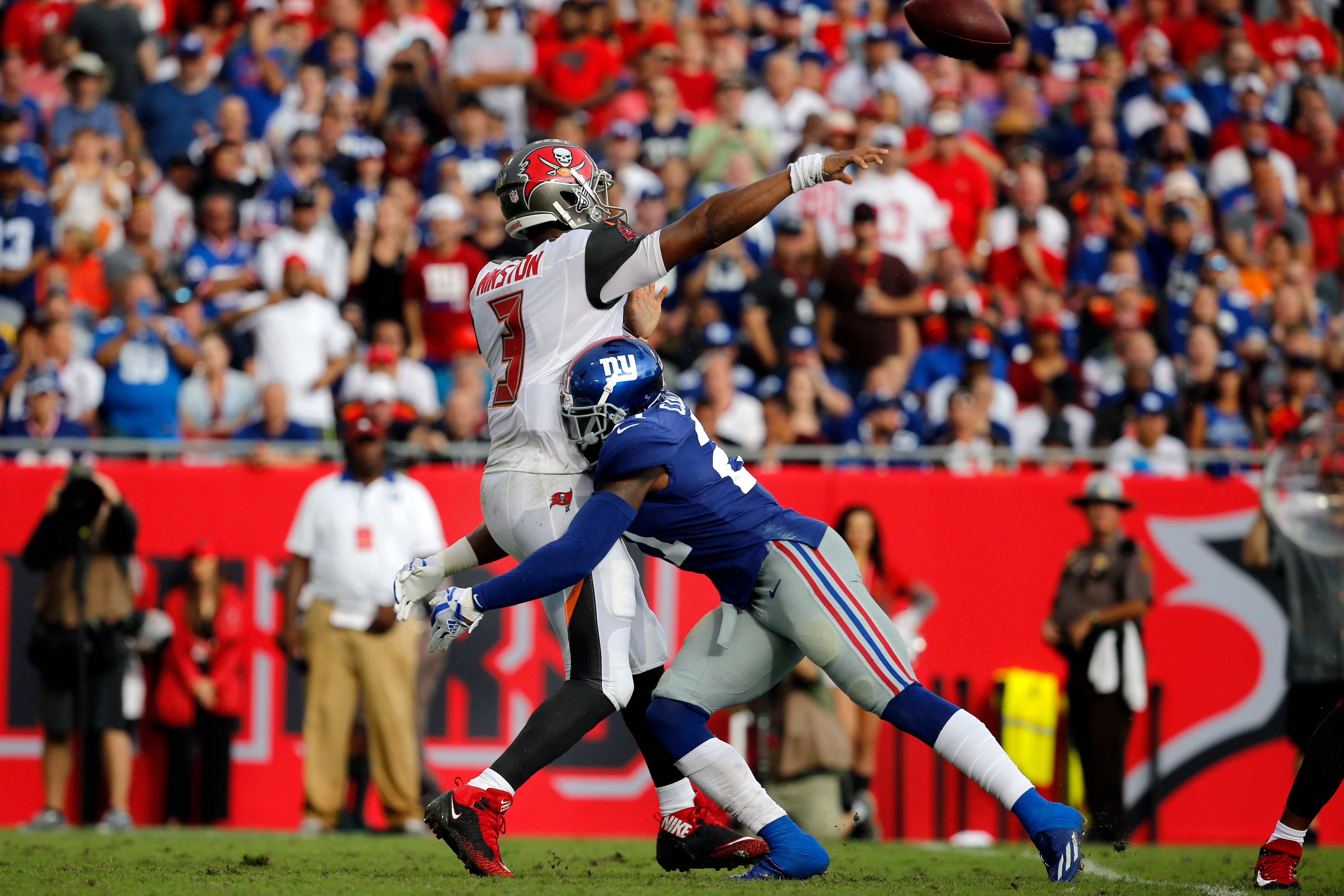 Oct 1, 2017; Tampa, FL, USA;New York Giants strong safety Landon Collins (21) pressures Tampa Bay Buccaneers quarterback Jameis Winston (3) during the first half at Raymond James Stadium. Mandatory Credit: Kim Klement-USA TODAY Sports / Kim Klement