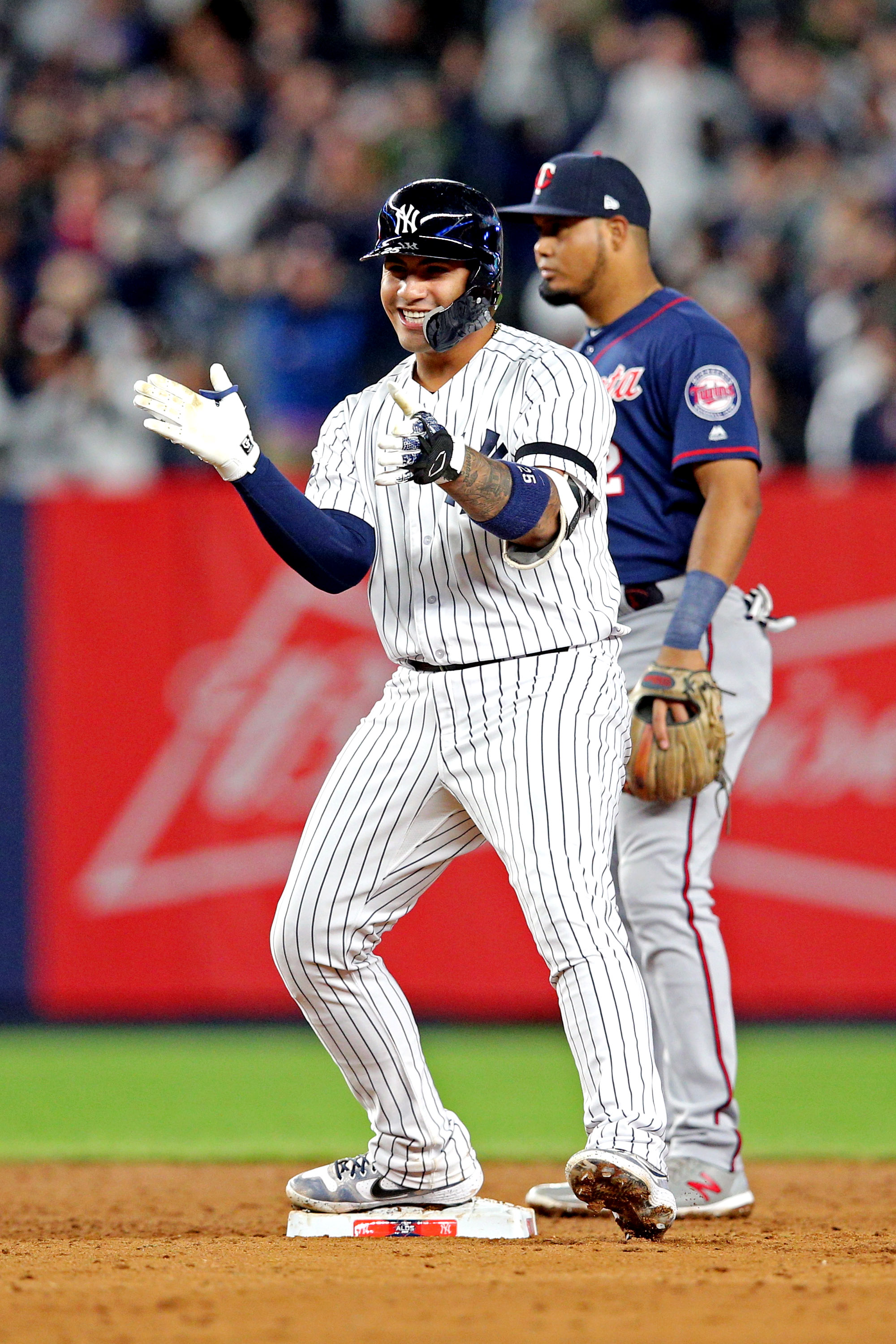 Oct 4, 2019; Bronx, NY, USA; New York Yankees second baseman Gleyber Torres (25) reacts after hitting a two RBI double during the fifth inning against the Minnesota Twins in game one of the 2019 ALDS playoff baseball series at Yankee Stadium. Mandatory Credit: Brad Penner-USA TODAY Sports / Brad Penner