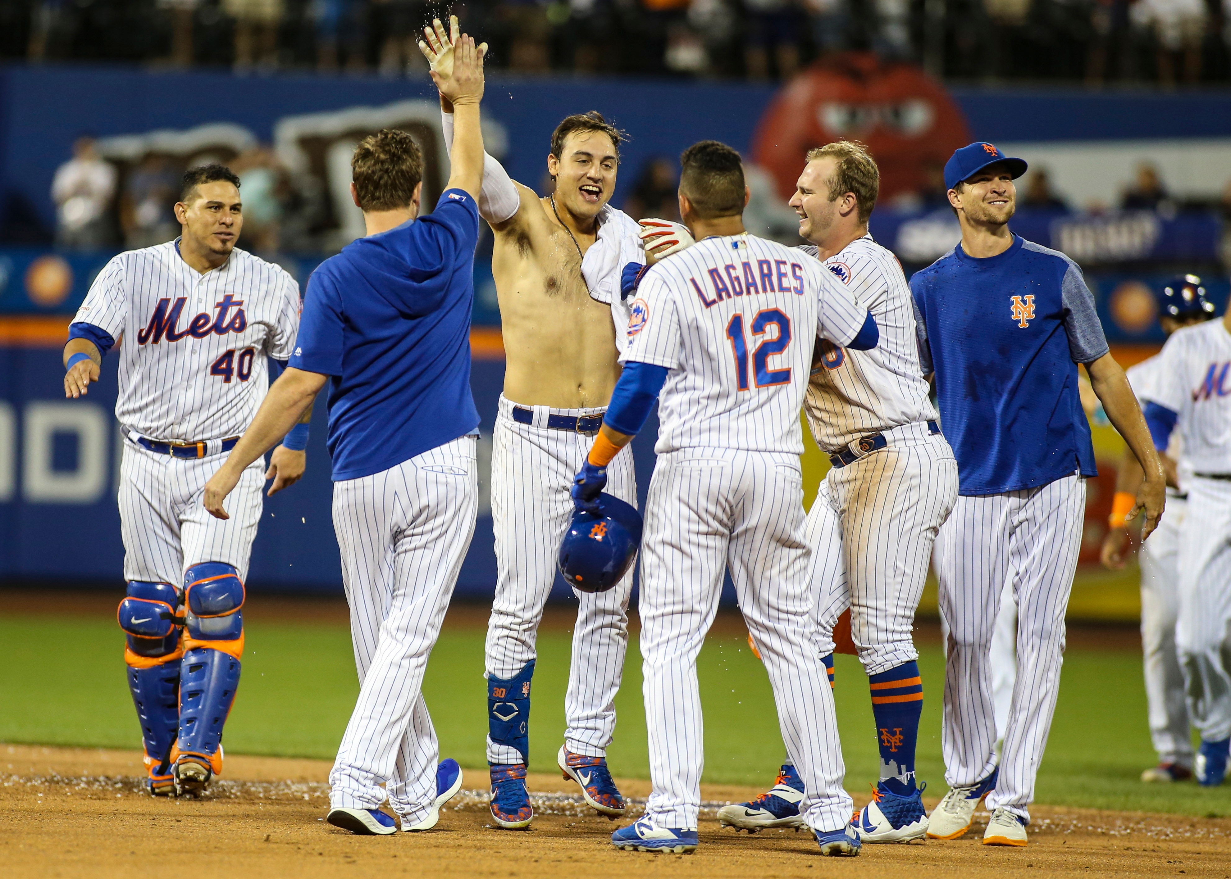 Aug 9, 2019; New York City, NY, USA; New York Mets center fielder Michael Conforto (30) celebrates with his teammates after hitting a walk off RBI single to beat the Washington Nationals 7-6 at Citi Field. Mandatory Credit: Wendell Cruz-USA TODAY Sports / Wendell Cruz