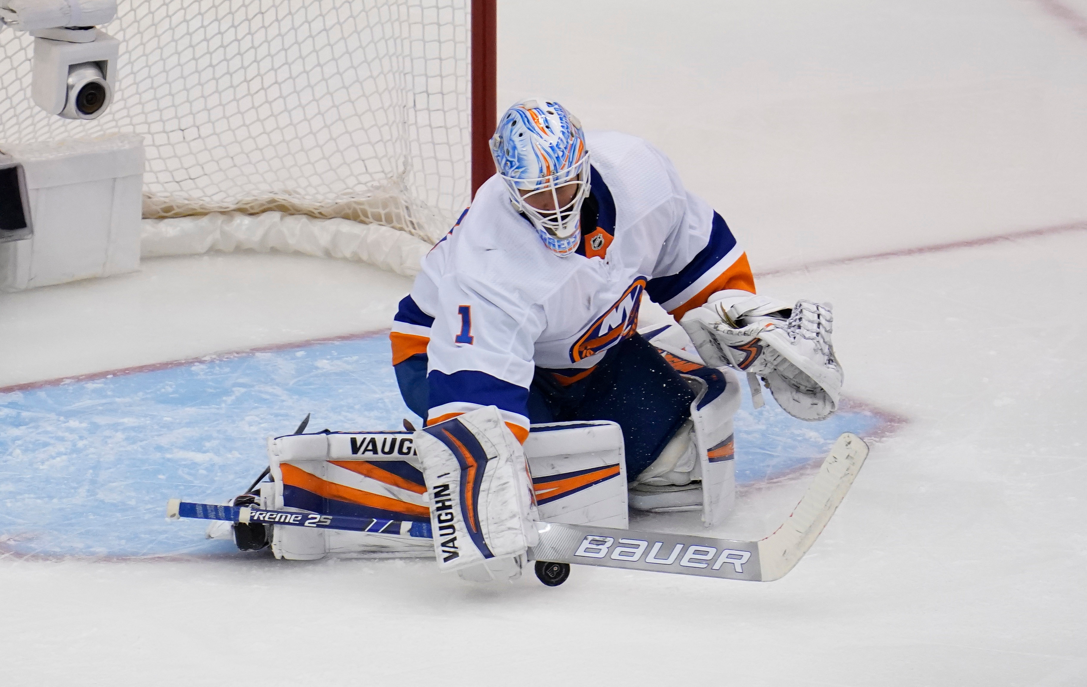 Sep 5, 2020; Toronto, Ontario, CAN; New York Islanders goaltender Thomas Greiss (1) makes a save against the Philadelphia Flyers during the third period in game seven of the second round of the 2020 Stanley Cup Playoffs at Scotiabank Arena. / John E. Sokolowski-USA TODAY Sports