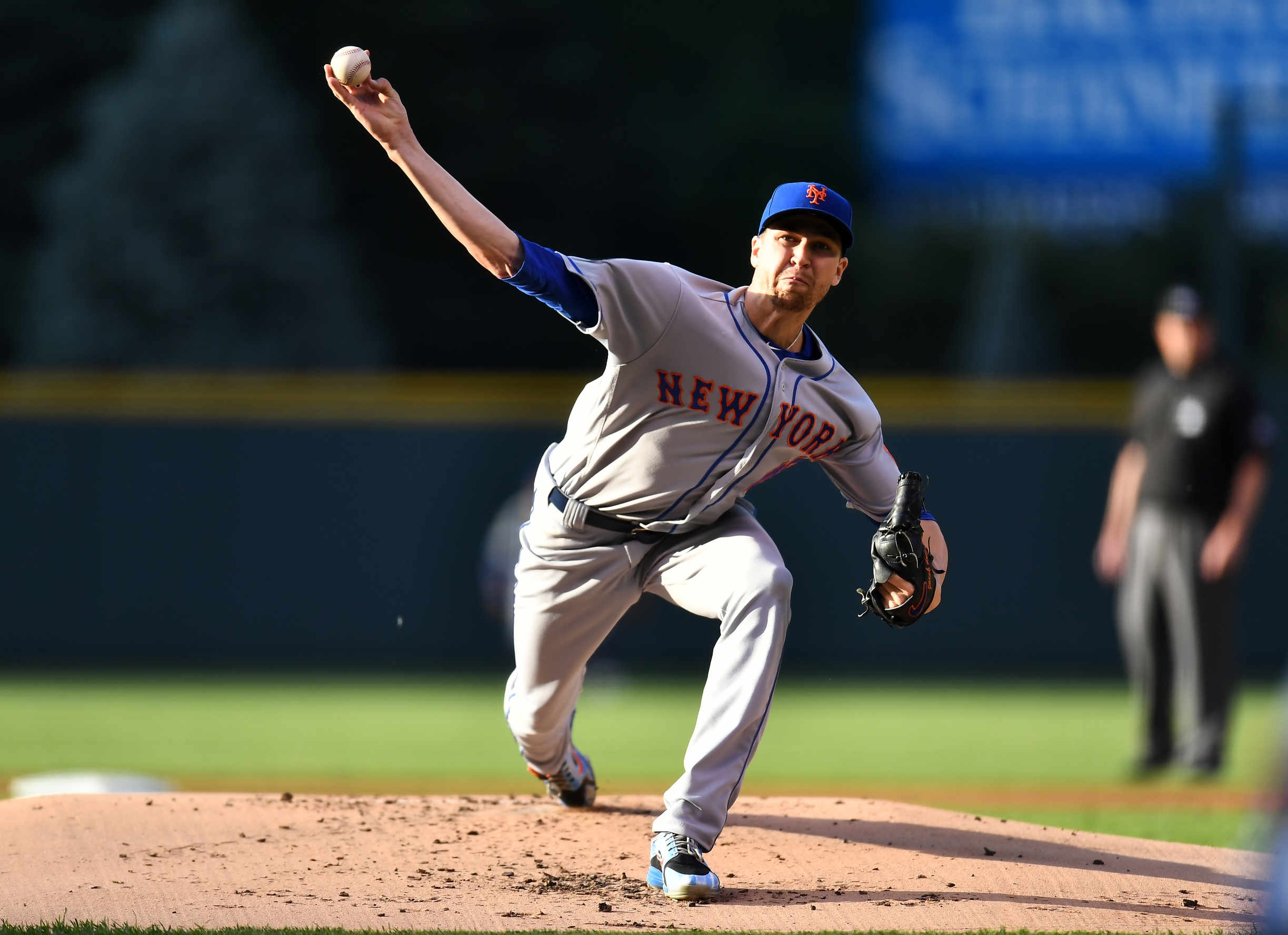 Jun 18, 2018; Denver, CO, USA; New York Mets starting pitcher Jacob deGrom (48) delivers a pitch in the first inning against the Colorado Rockies at Coors Field. Mandatory Credit: Ron Chenoy-USA TODAY Sports / Ron Chenoy